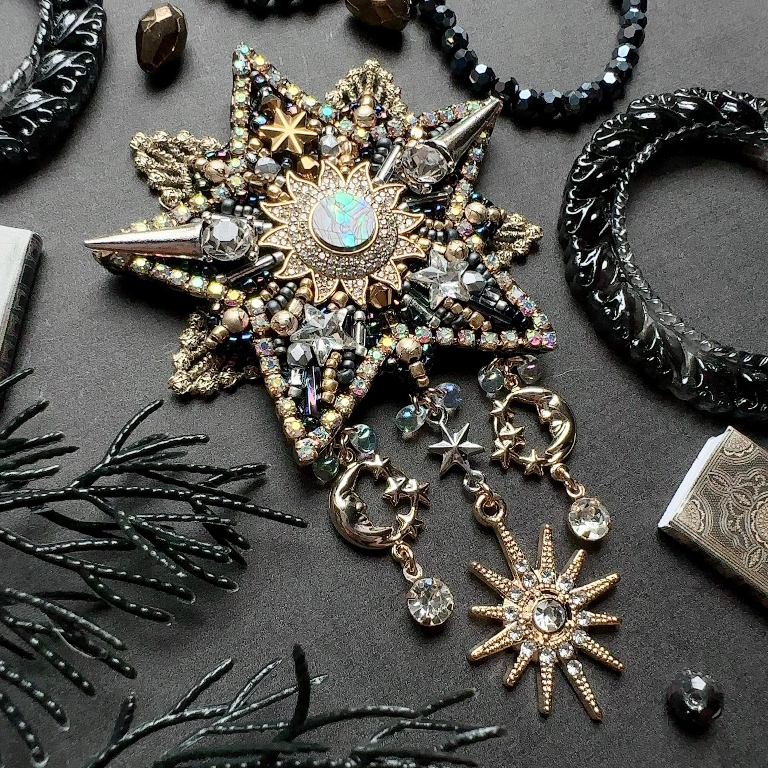 ビーズ刺繍のブローチ・ネックレス・バッグチャームの3wayです。