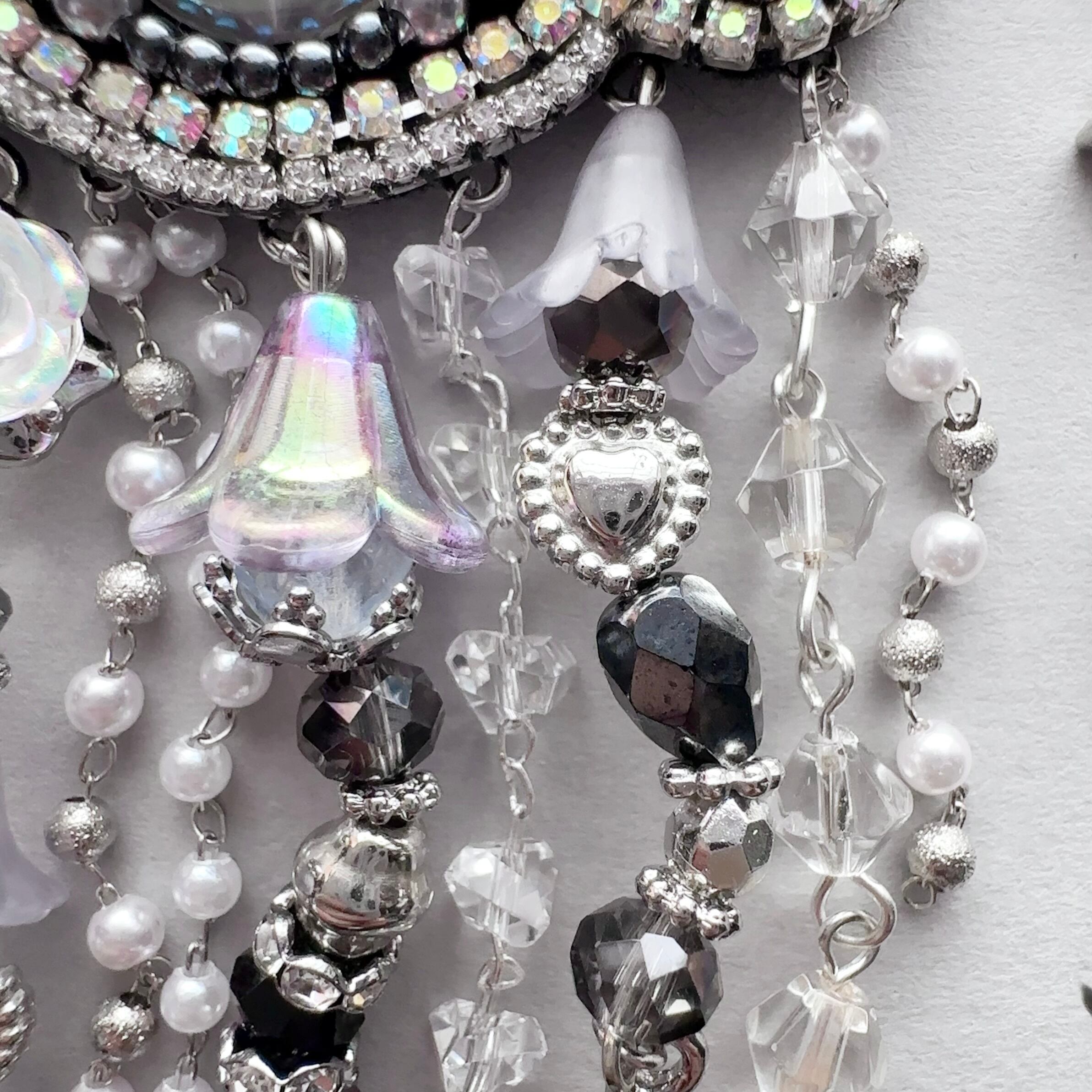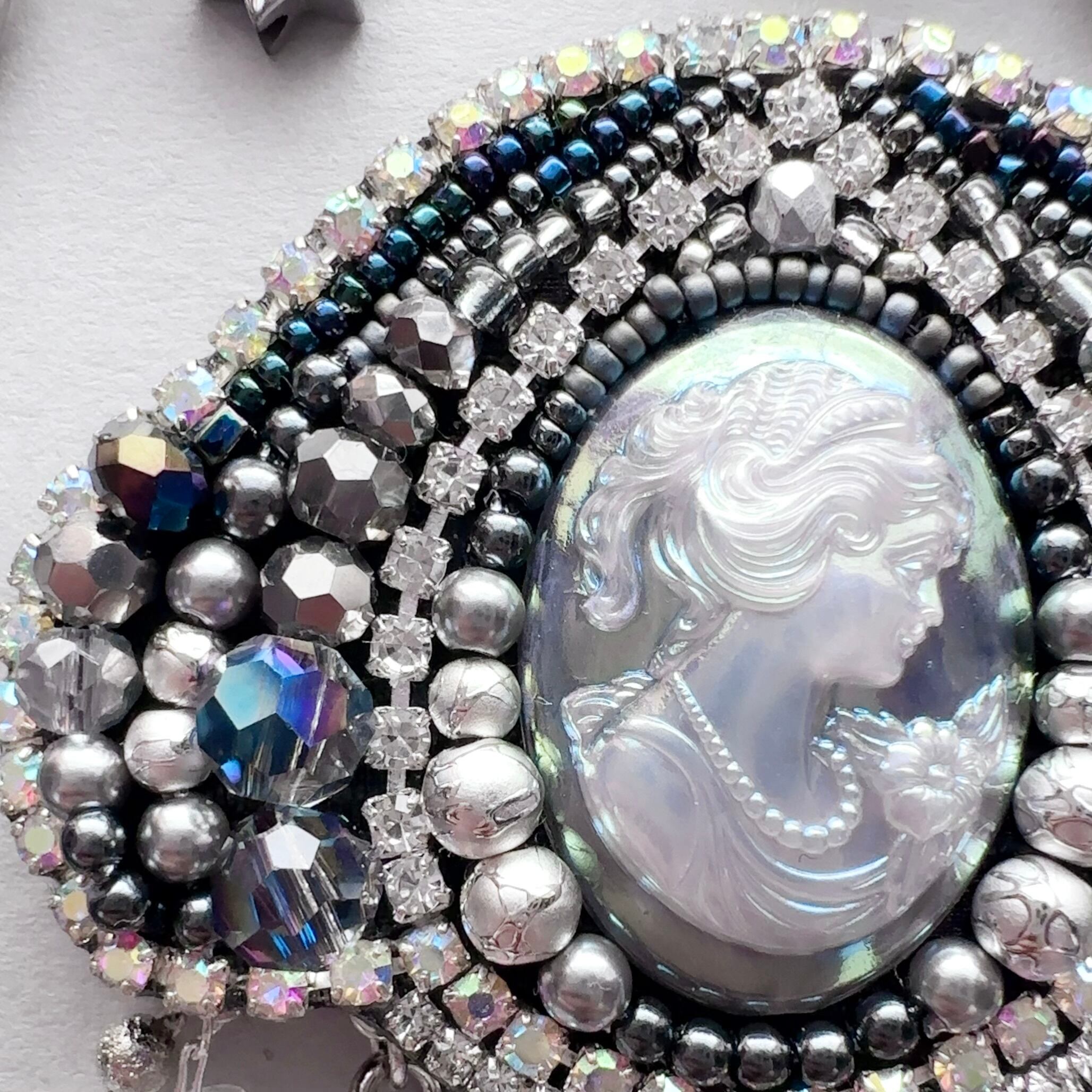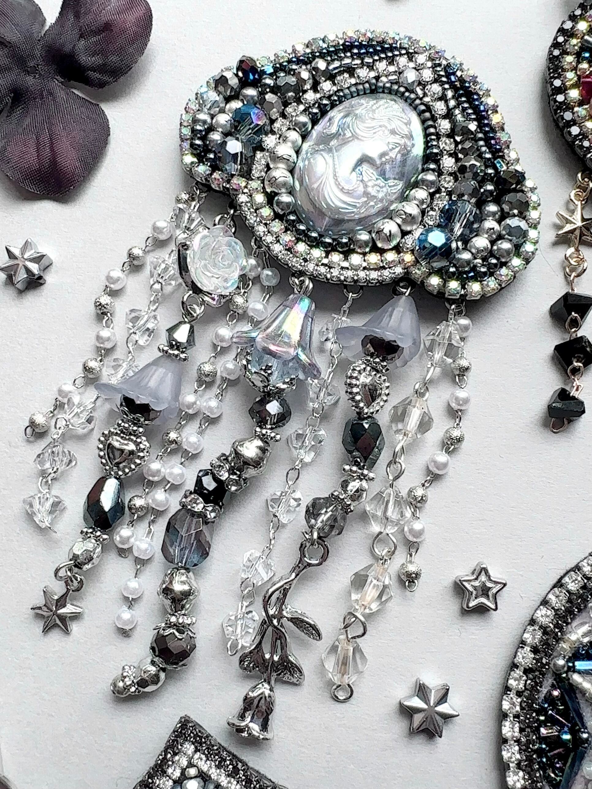 ビーズ刺繍のブローチ・ネックレス・バッグチャームの3wayです。