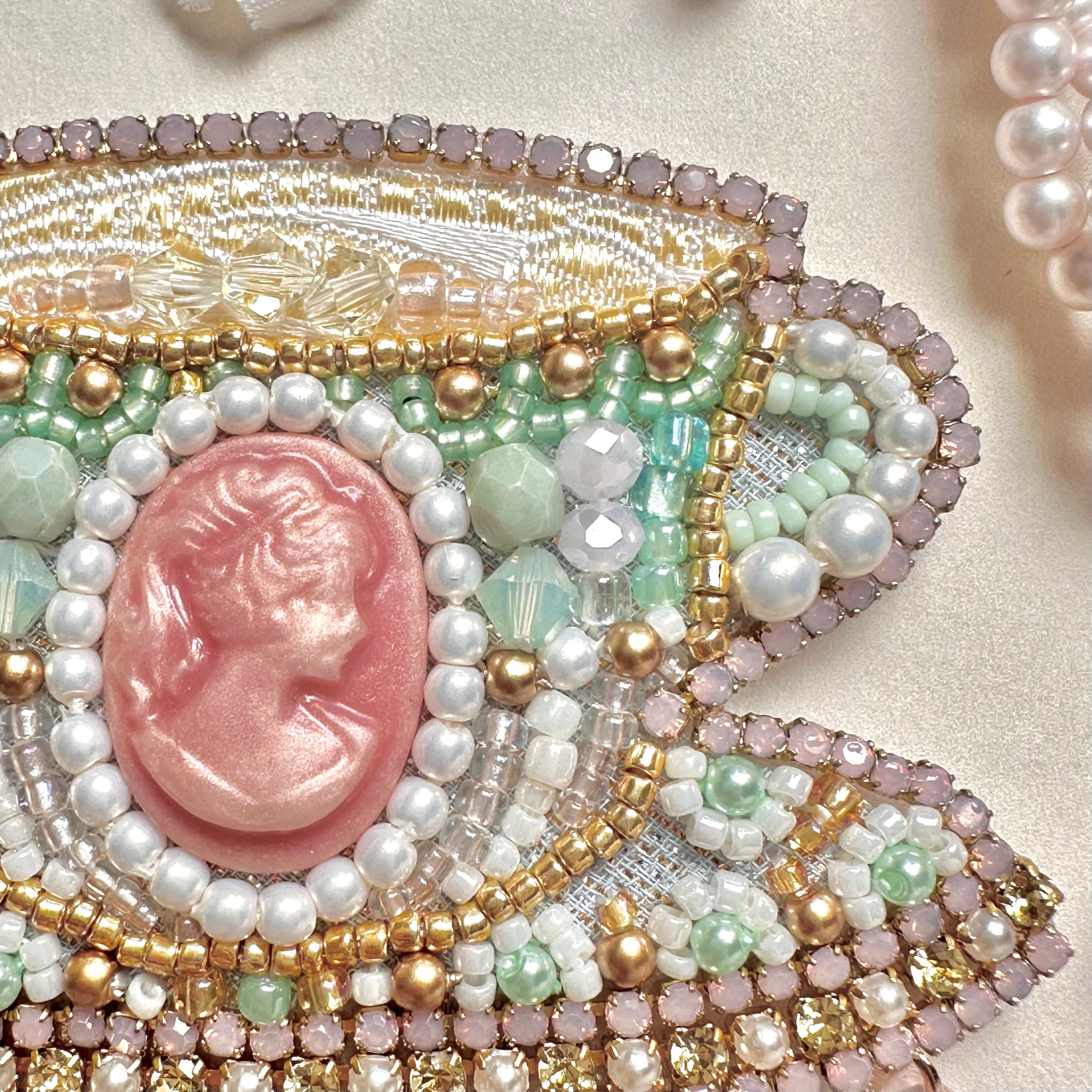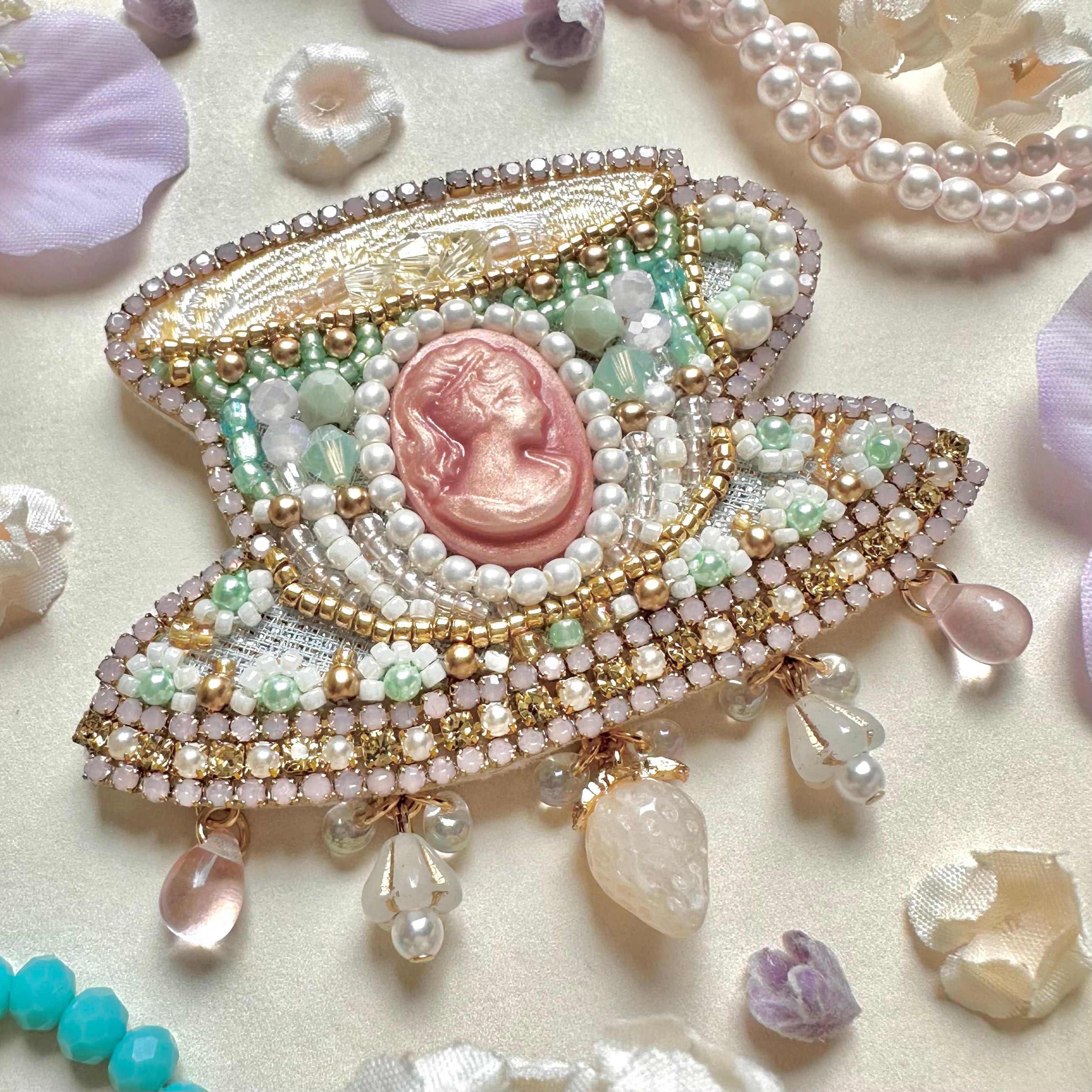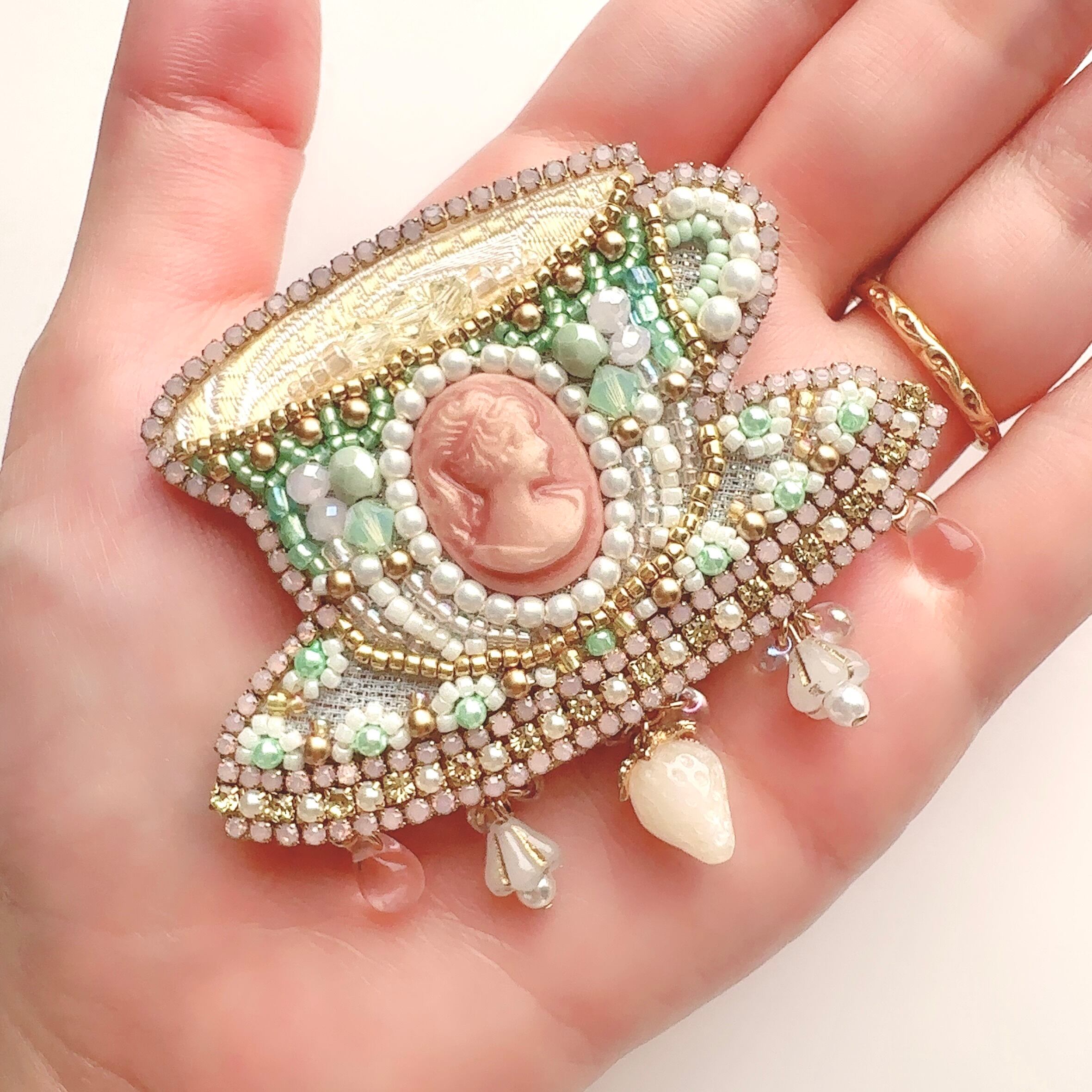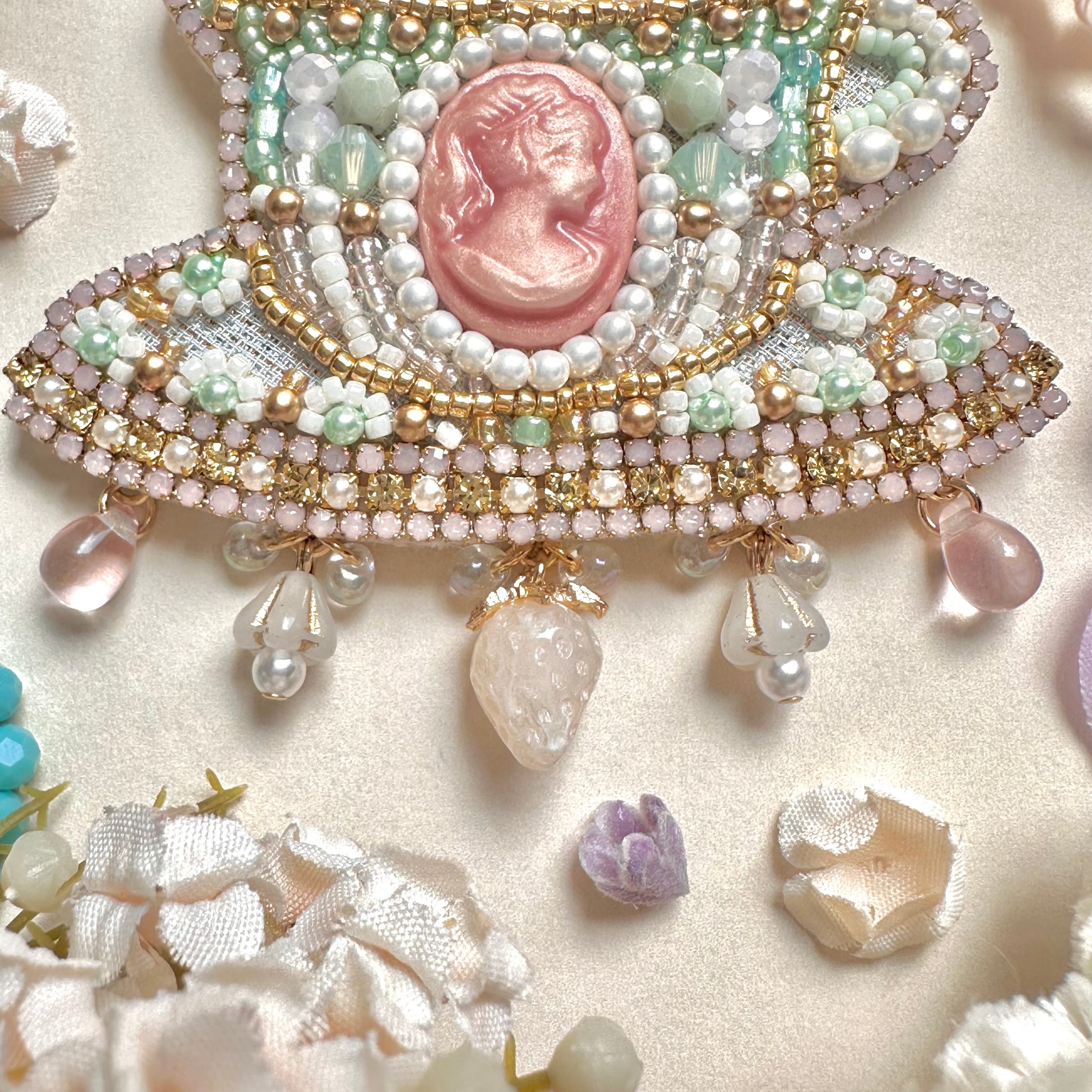 ビーズ刺繍のブローチ・ネックレス・バッグチャームの3wayです。
