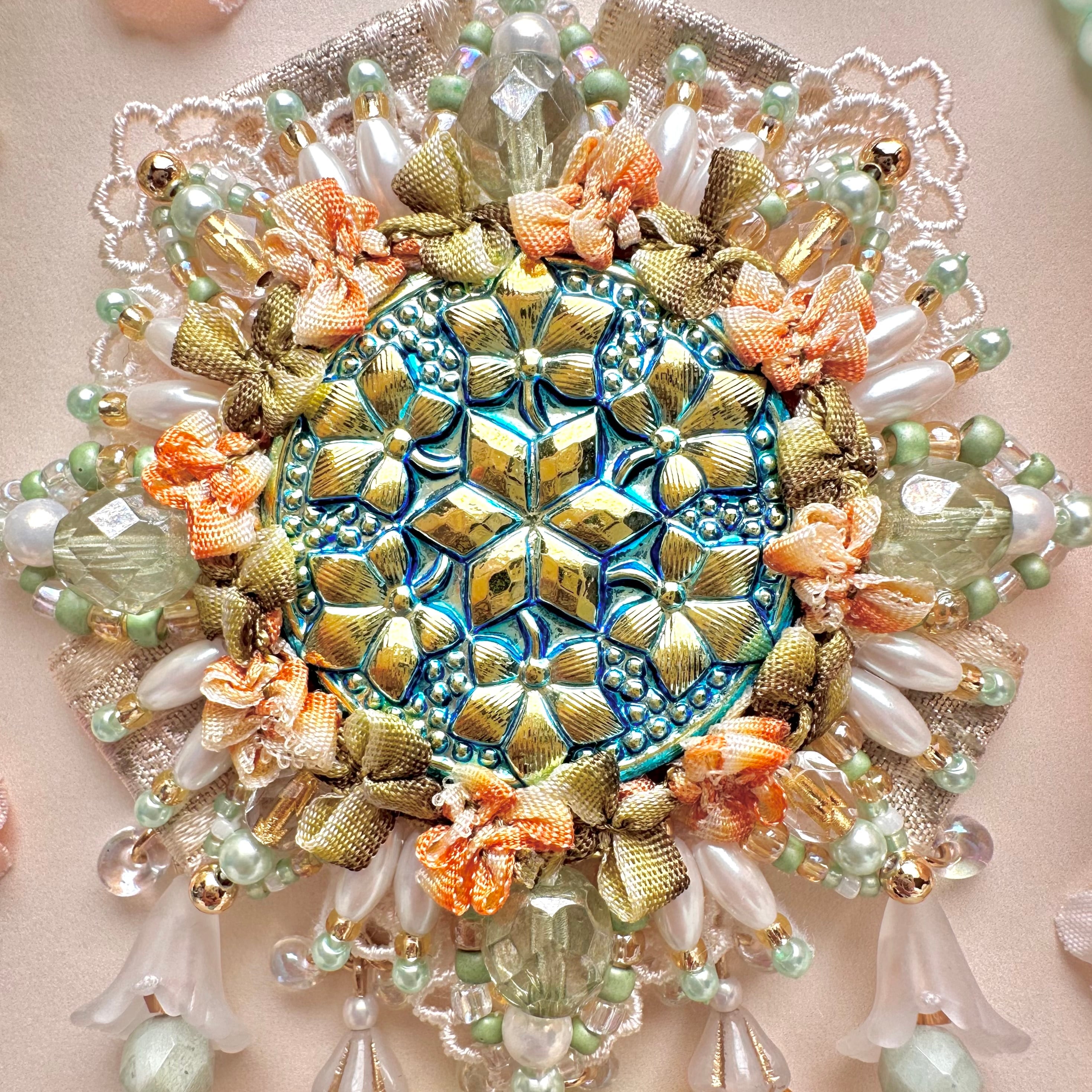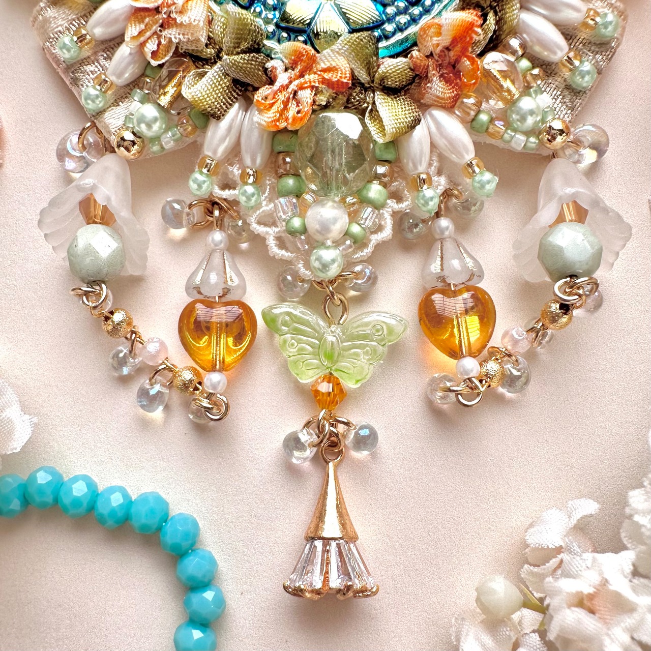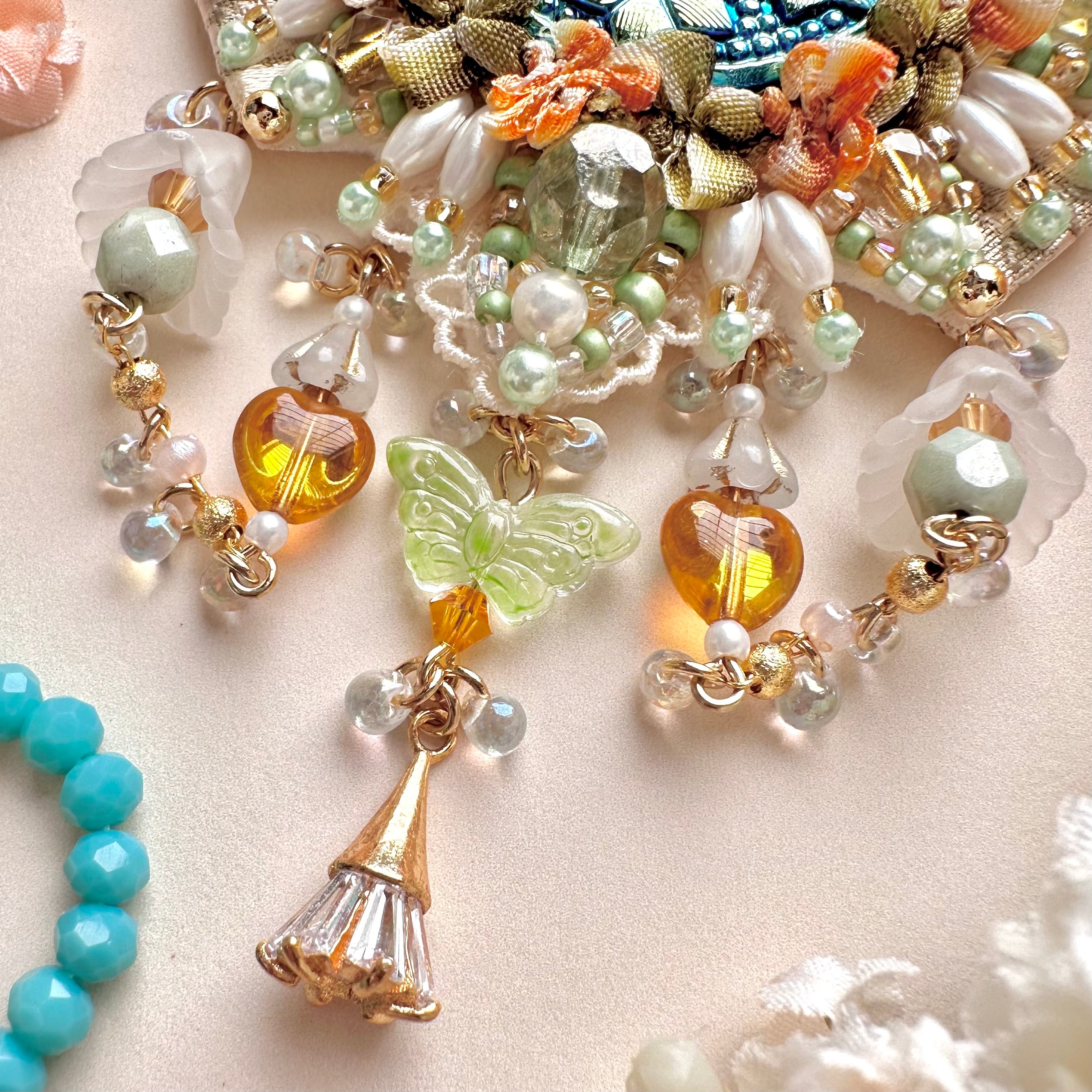ビーズ刺繍のブローチ・ネックレス・バッグチャームの3wayです。