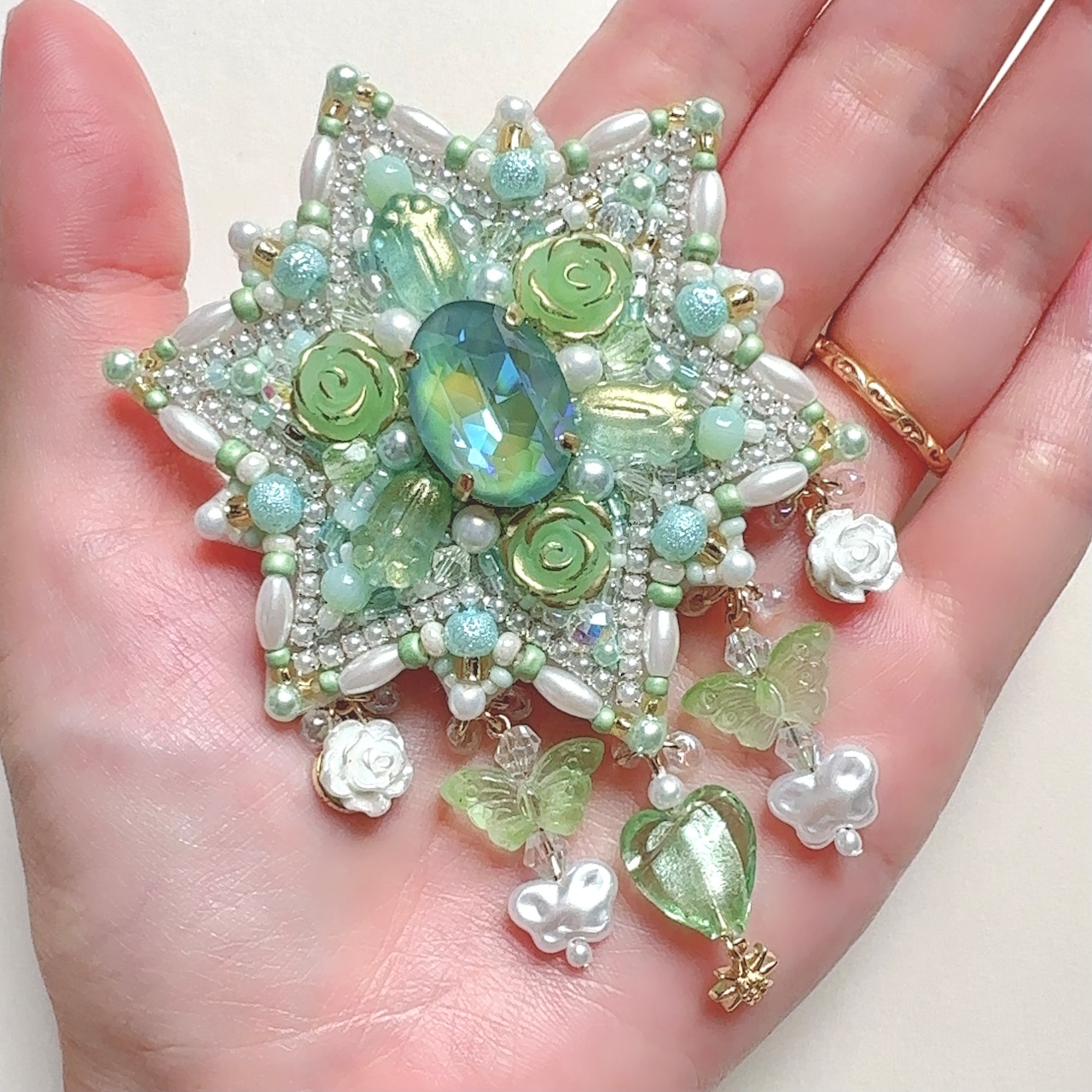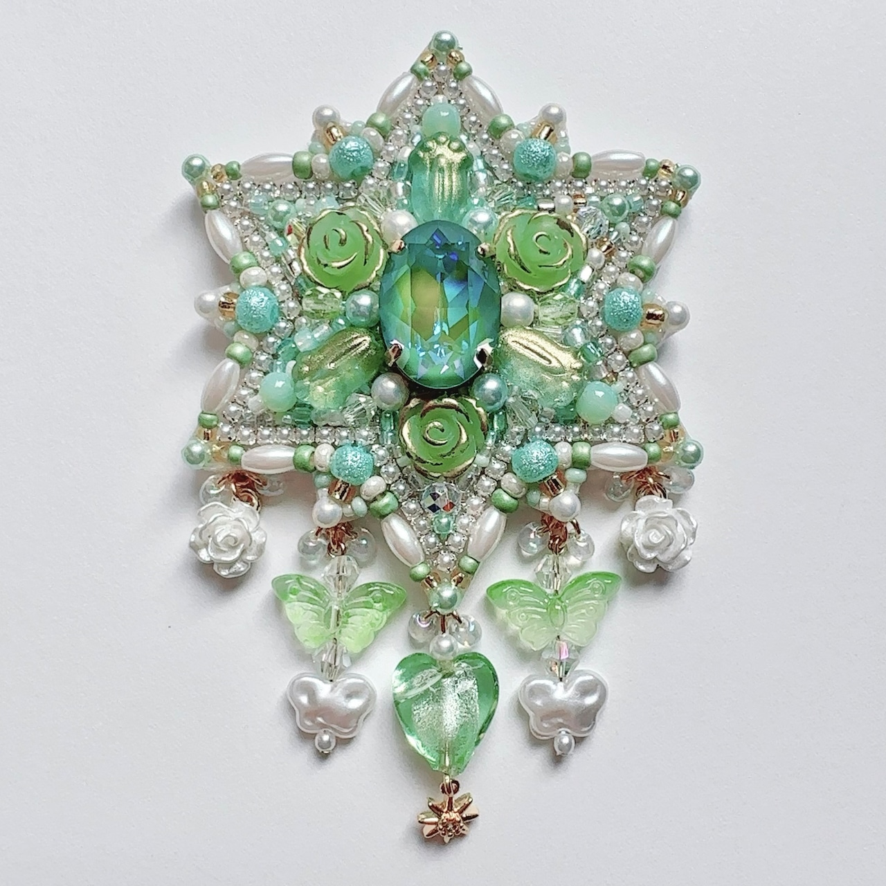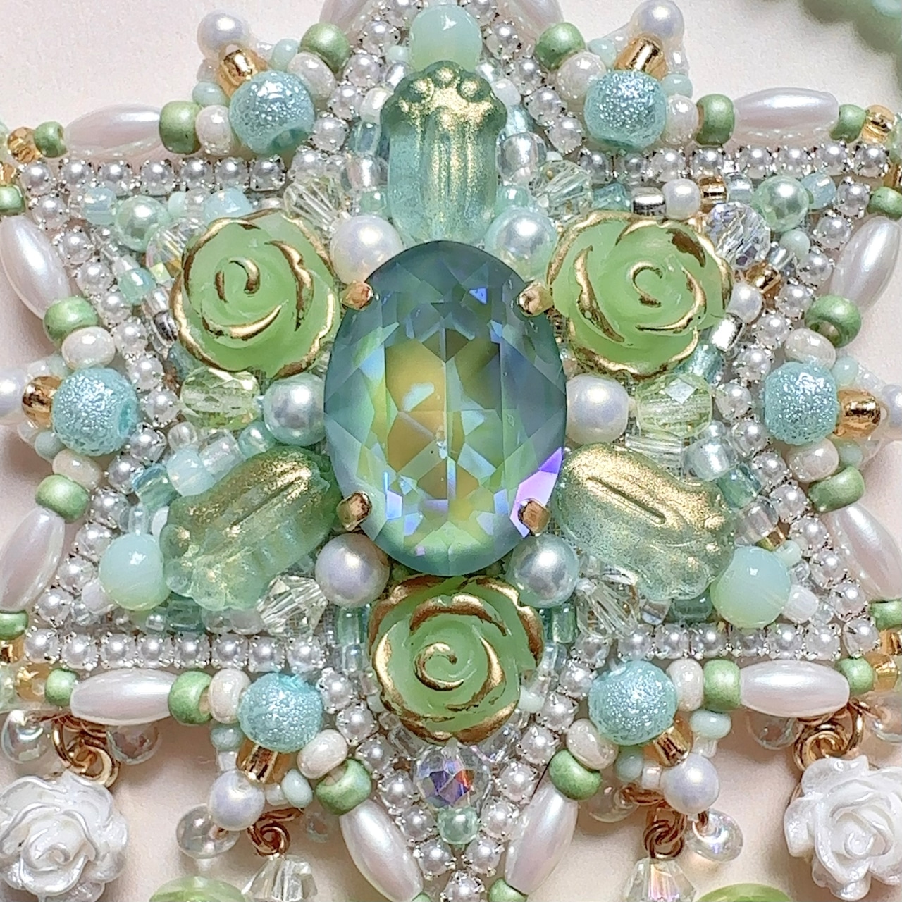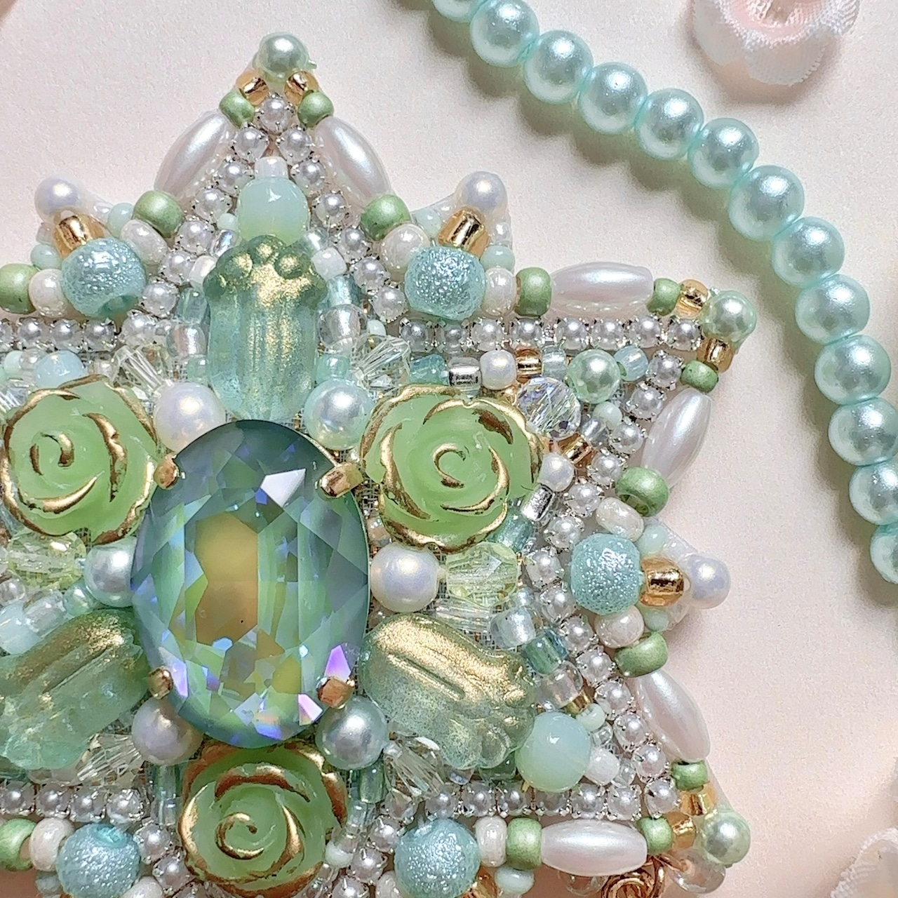 ビーズ刺繍のブローチ・ネックレス・バッグチャームの3wayです。