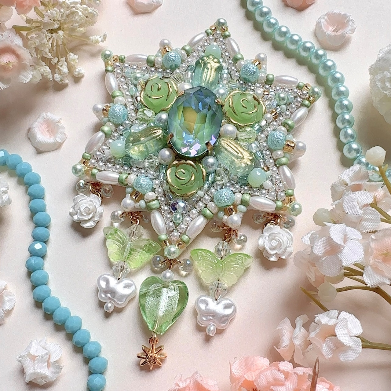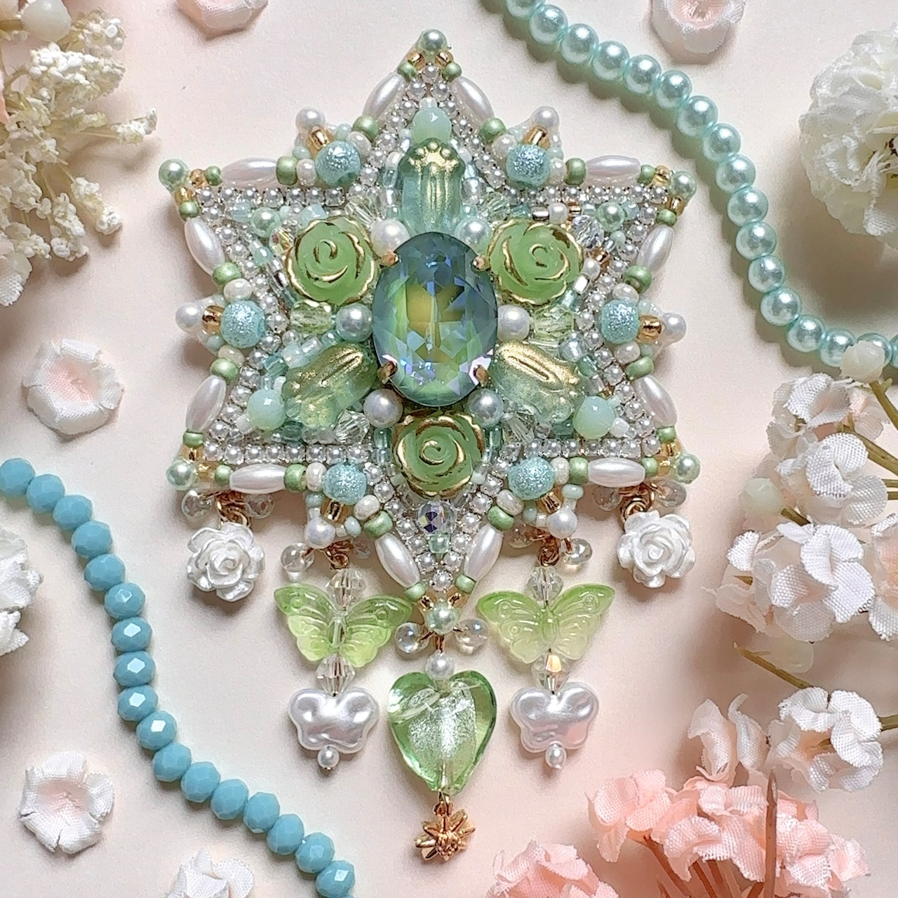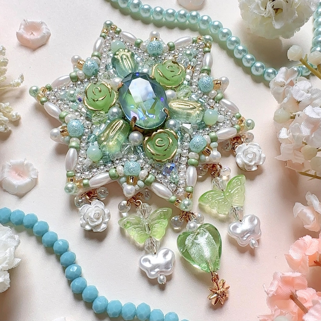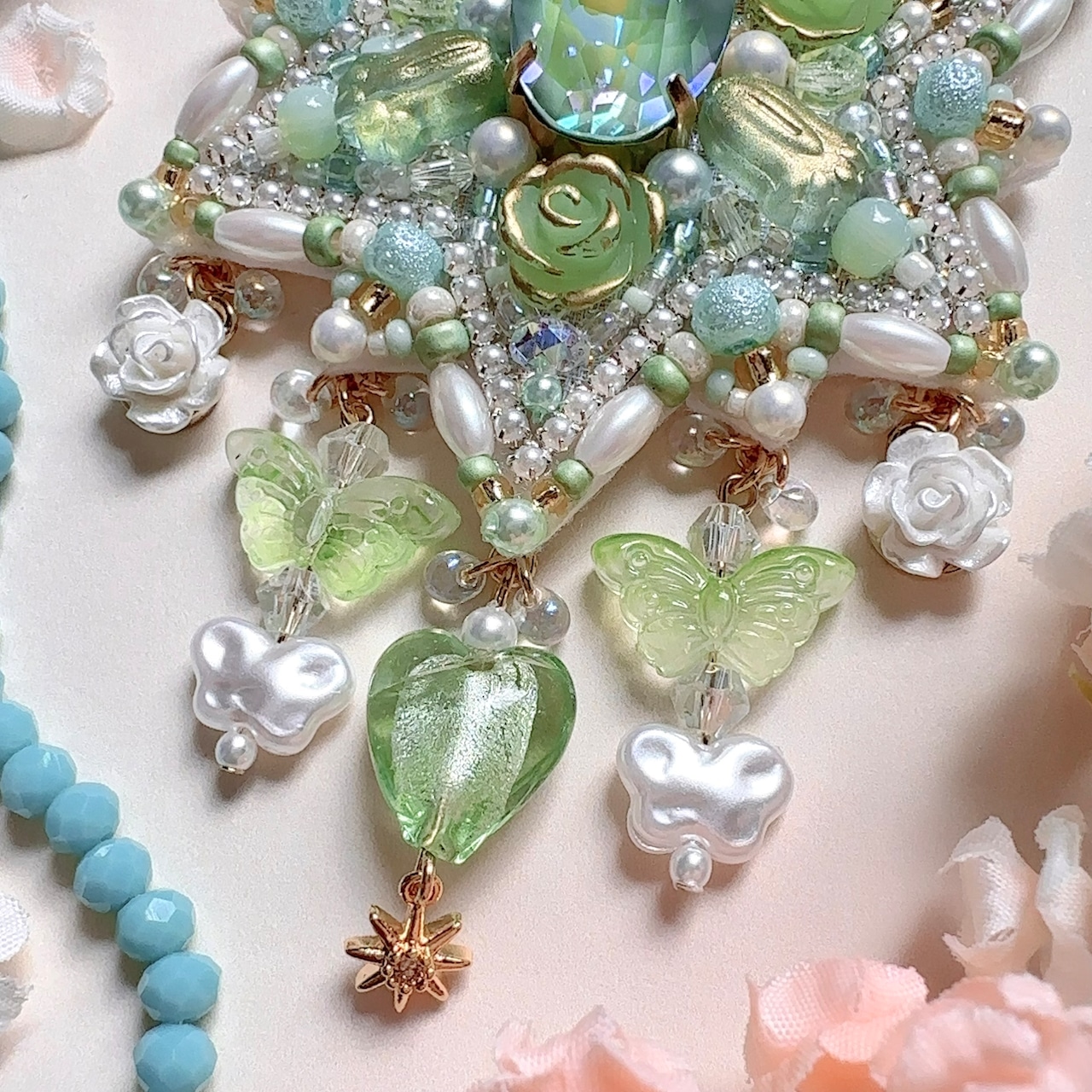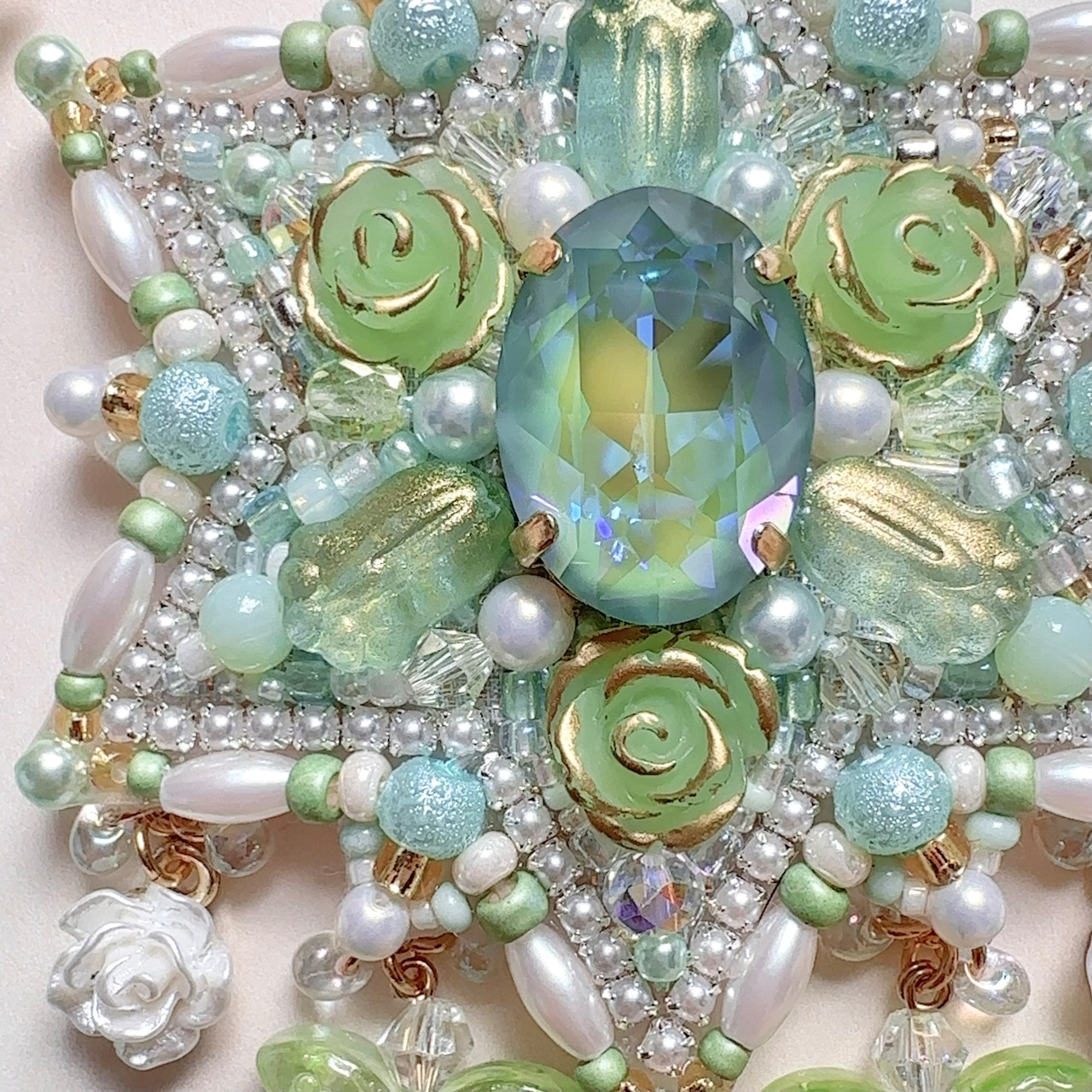 ビーズ刺繍のブローチ・ネックレス・バッグチャームの3wayです。