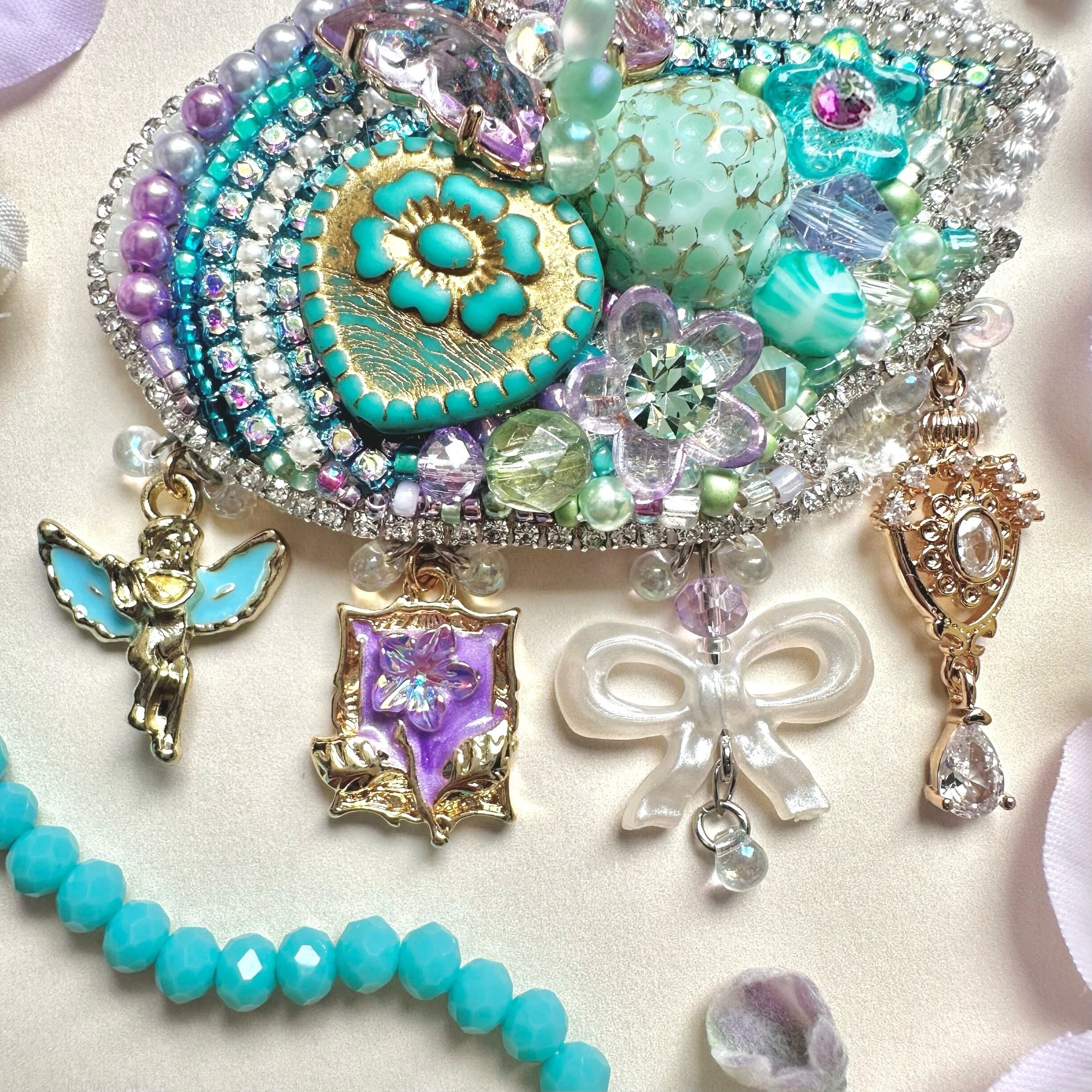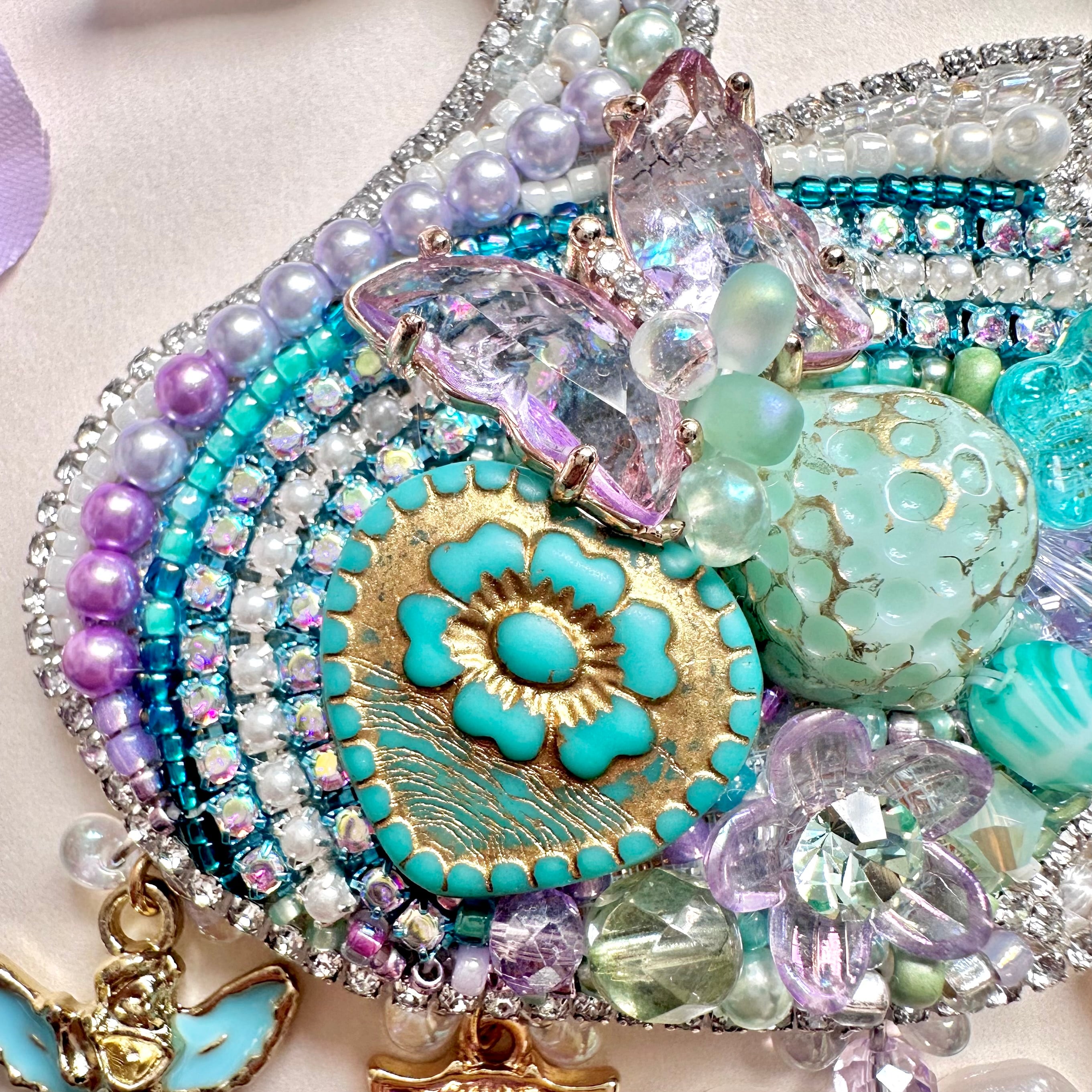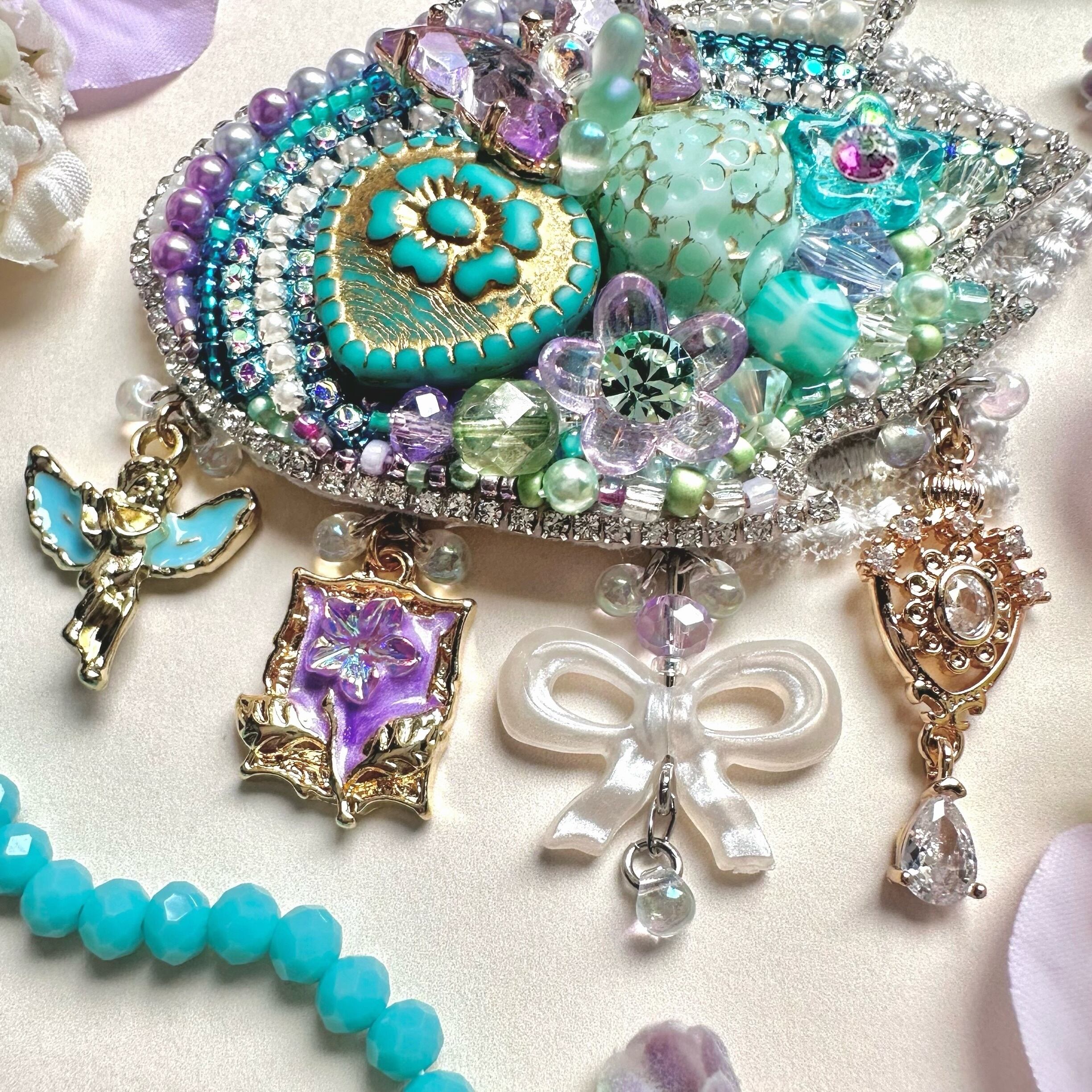 ビーズ刺繍のブローチ・ネックレス・バッグチャームの3wayです。