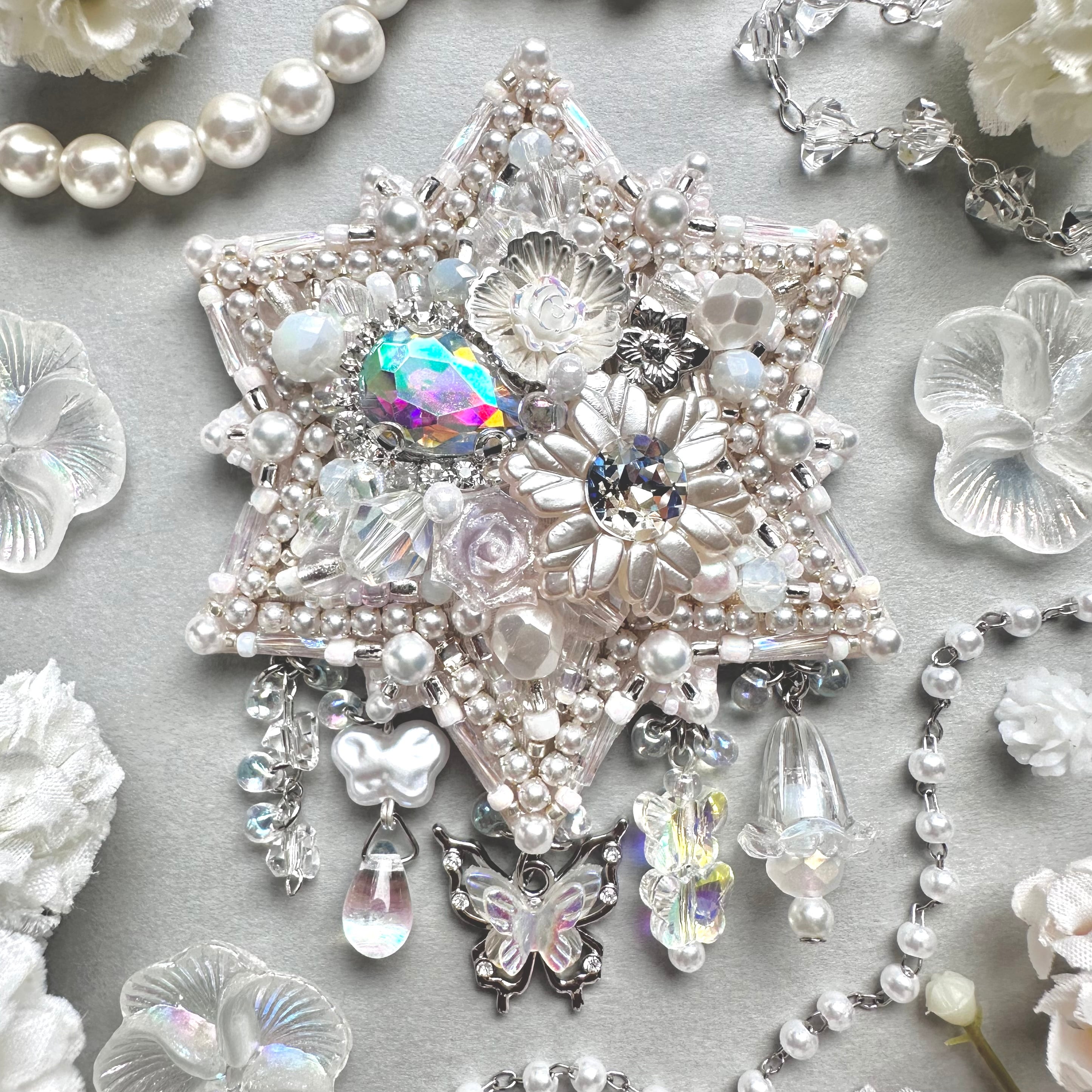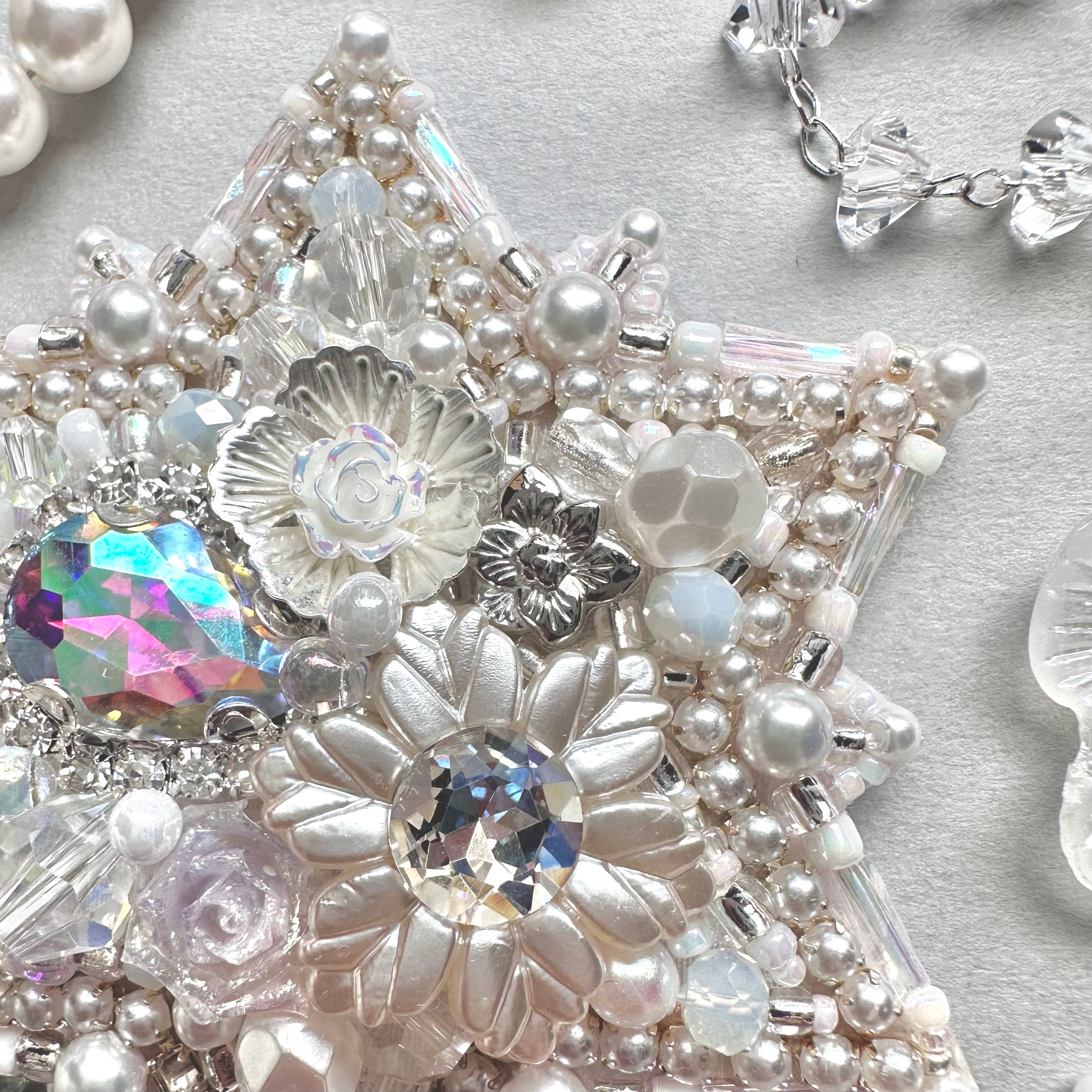 ビーズ刺繍のブローチ・ネックレス・バッグチャームの3wayです。