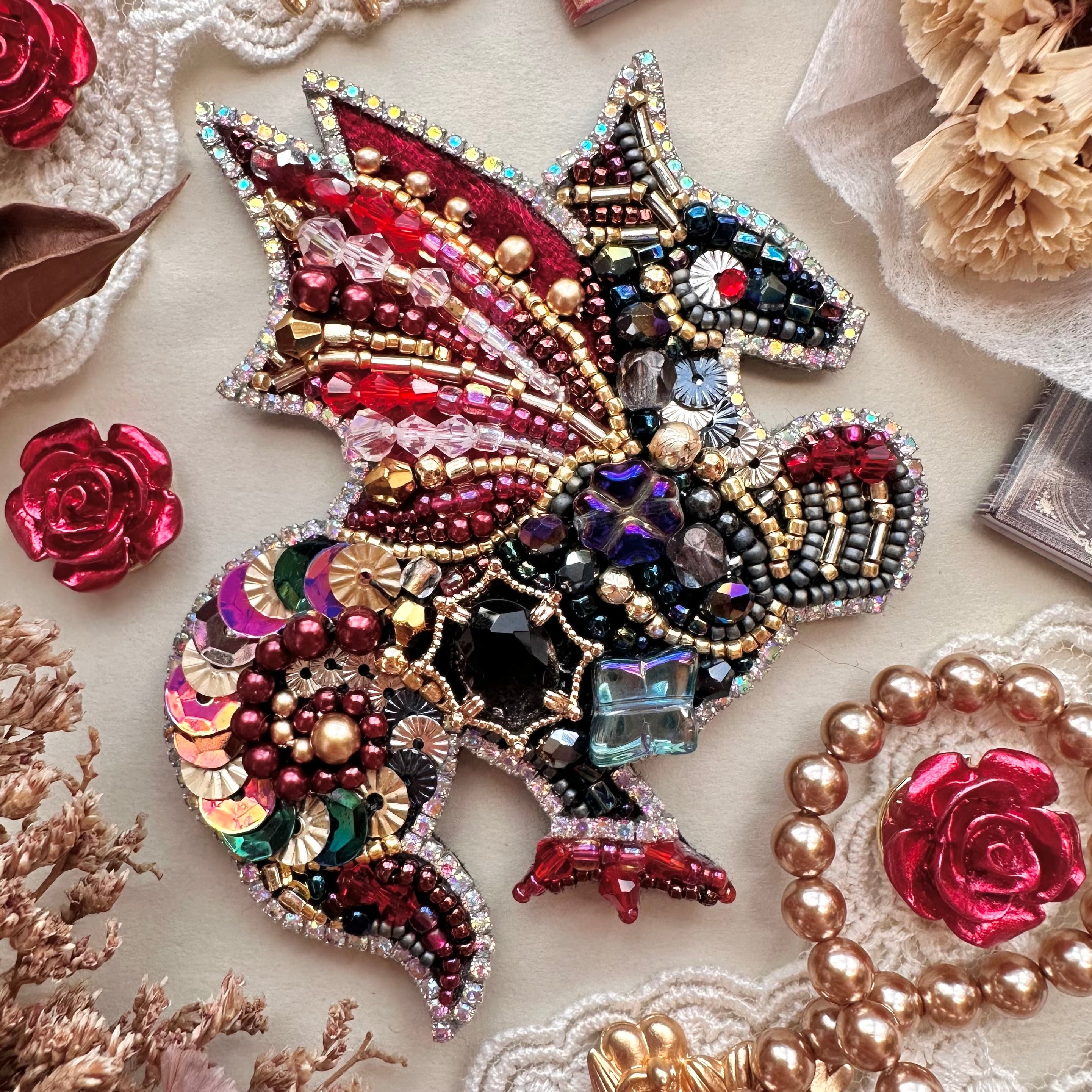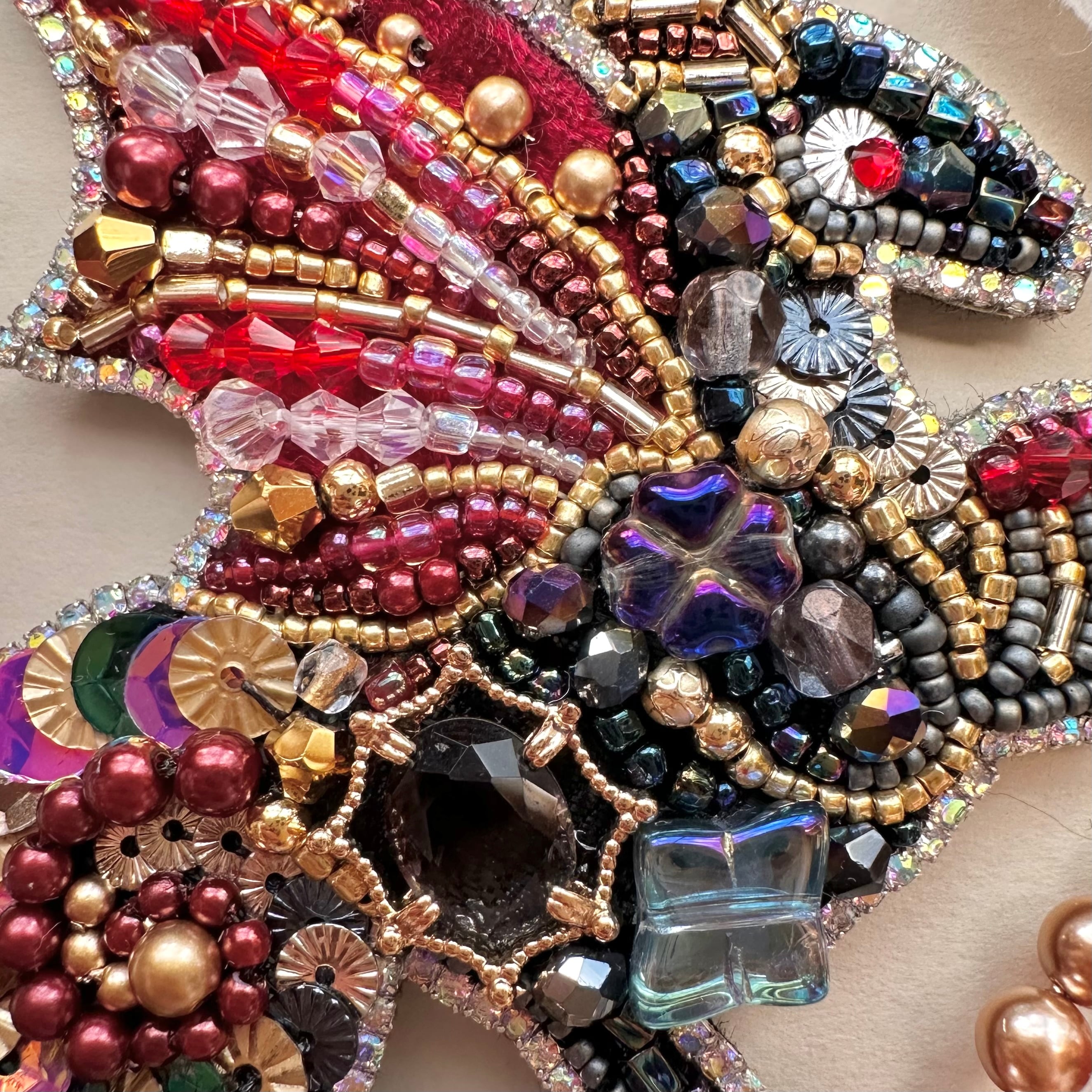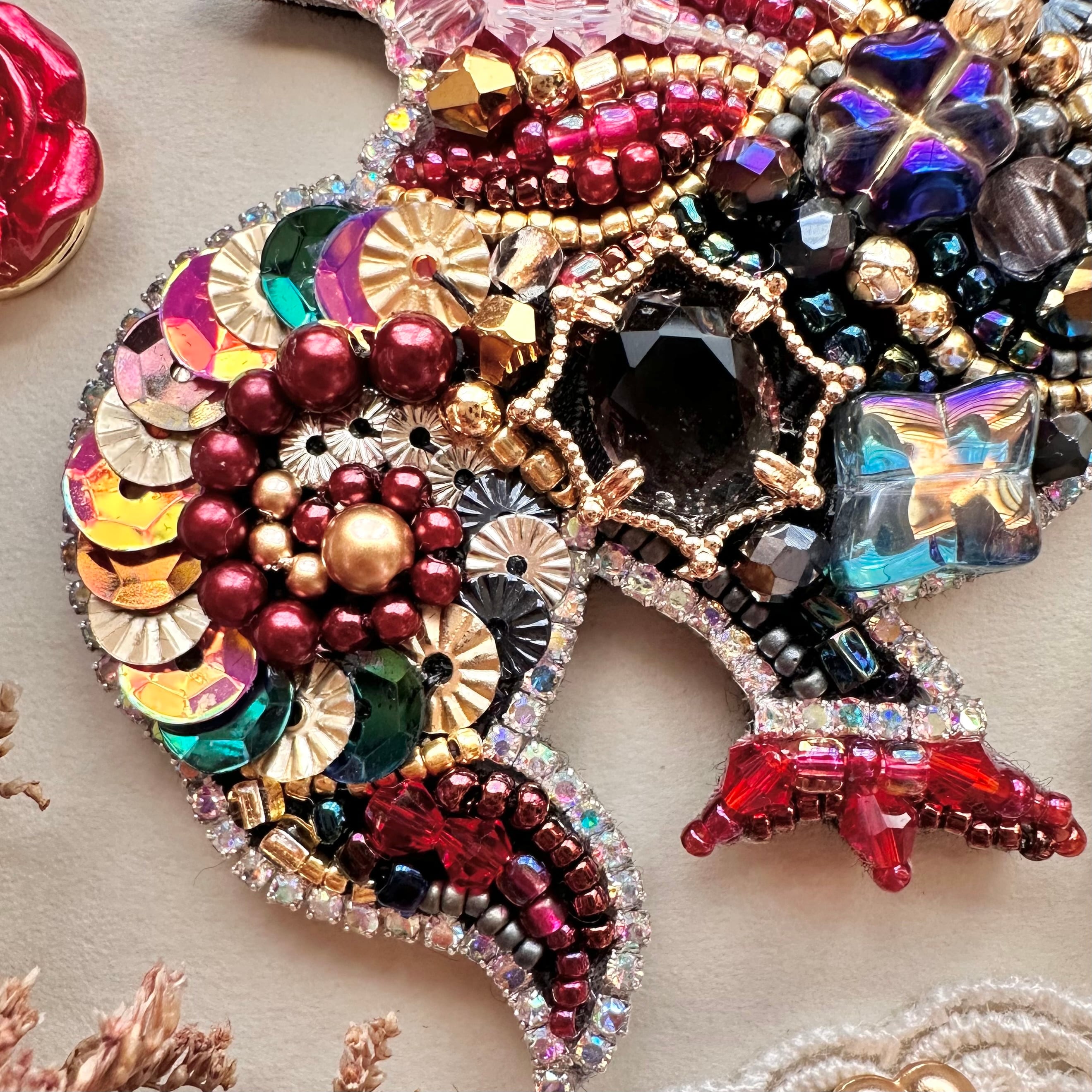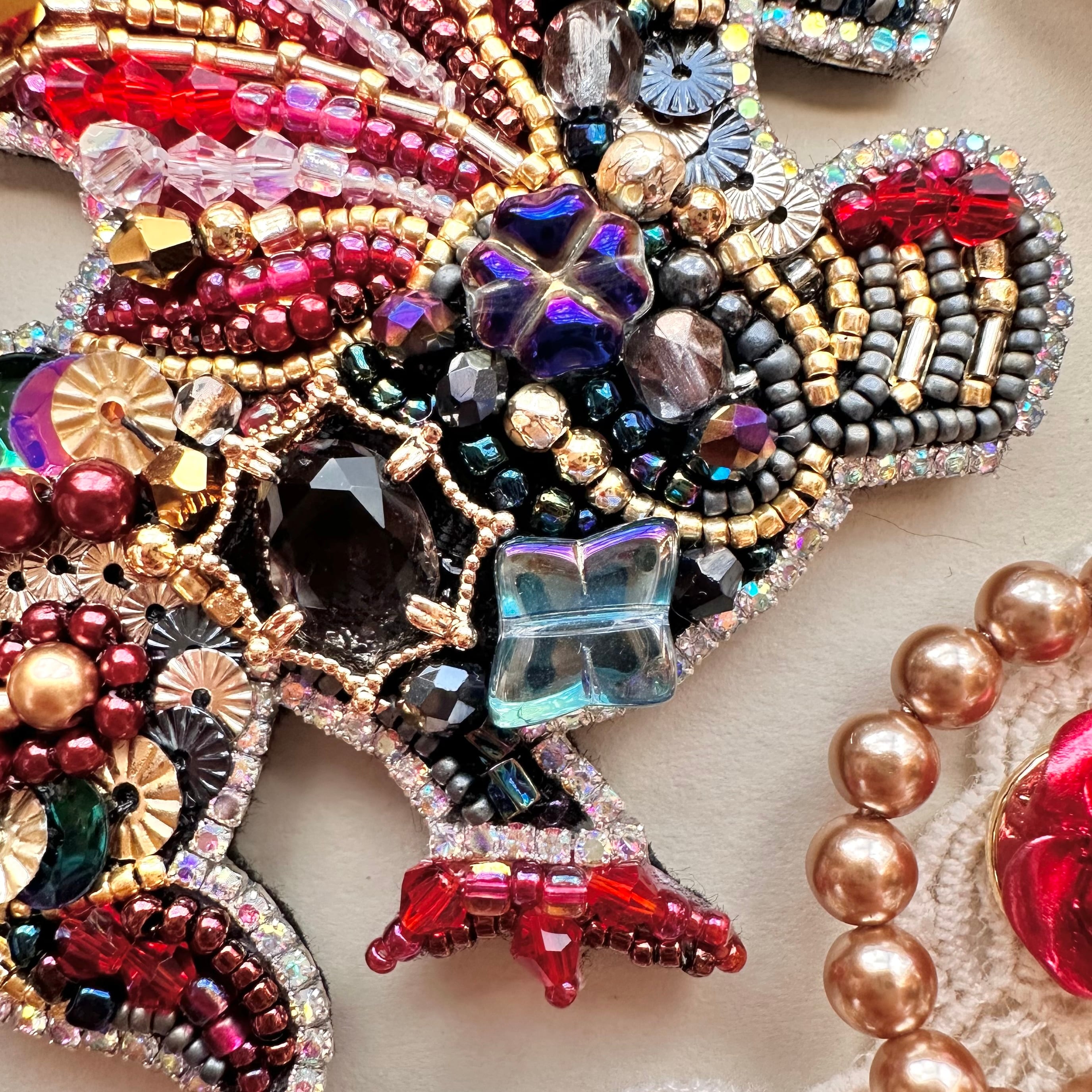 ビーズ刺繍のブローチ・ネックレス・バッグチャームの3wayです。