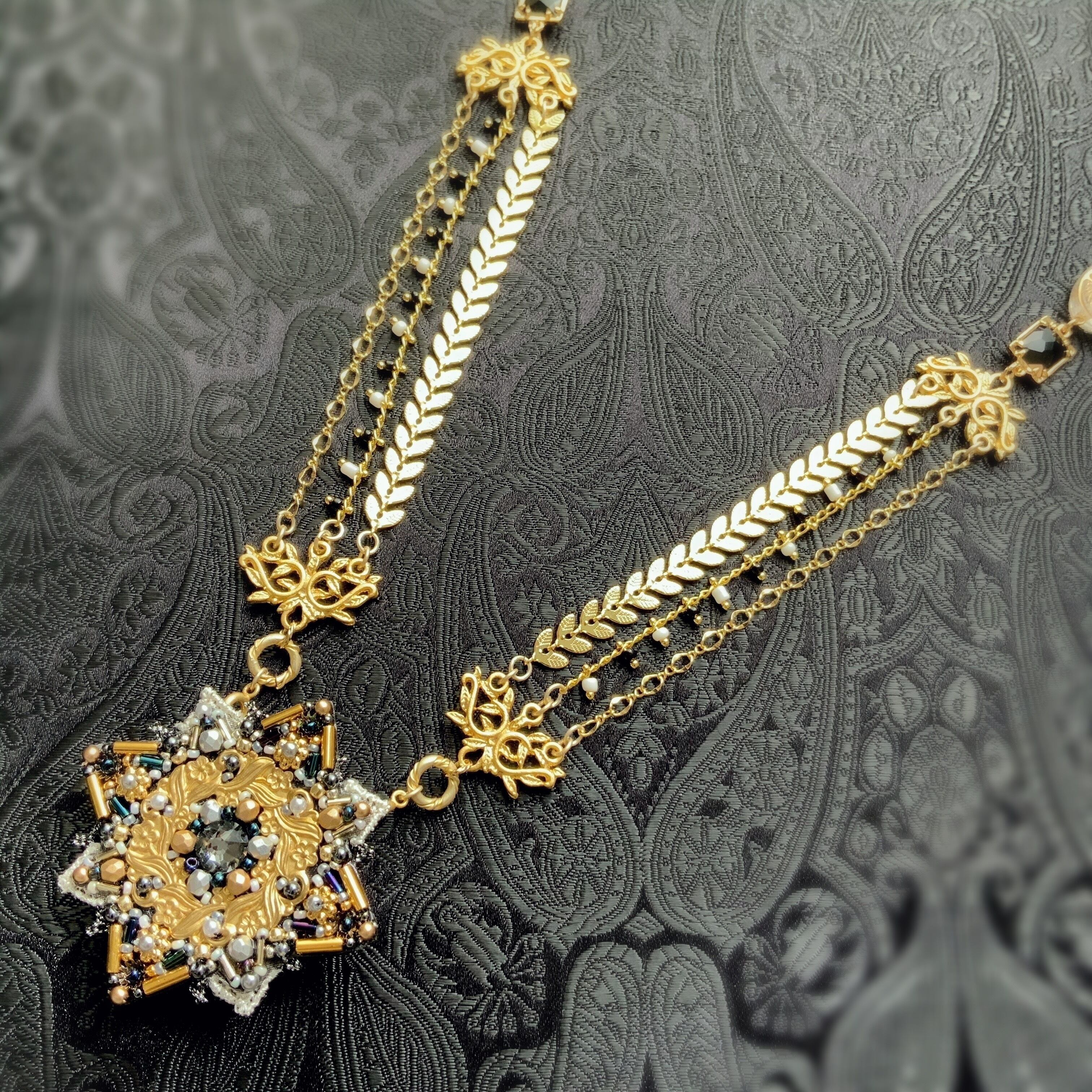 ビーズ刺繍のブローチ・ネックレス・バッグチャームの3wayです。