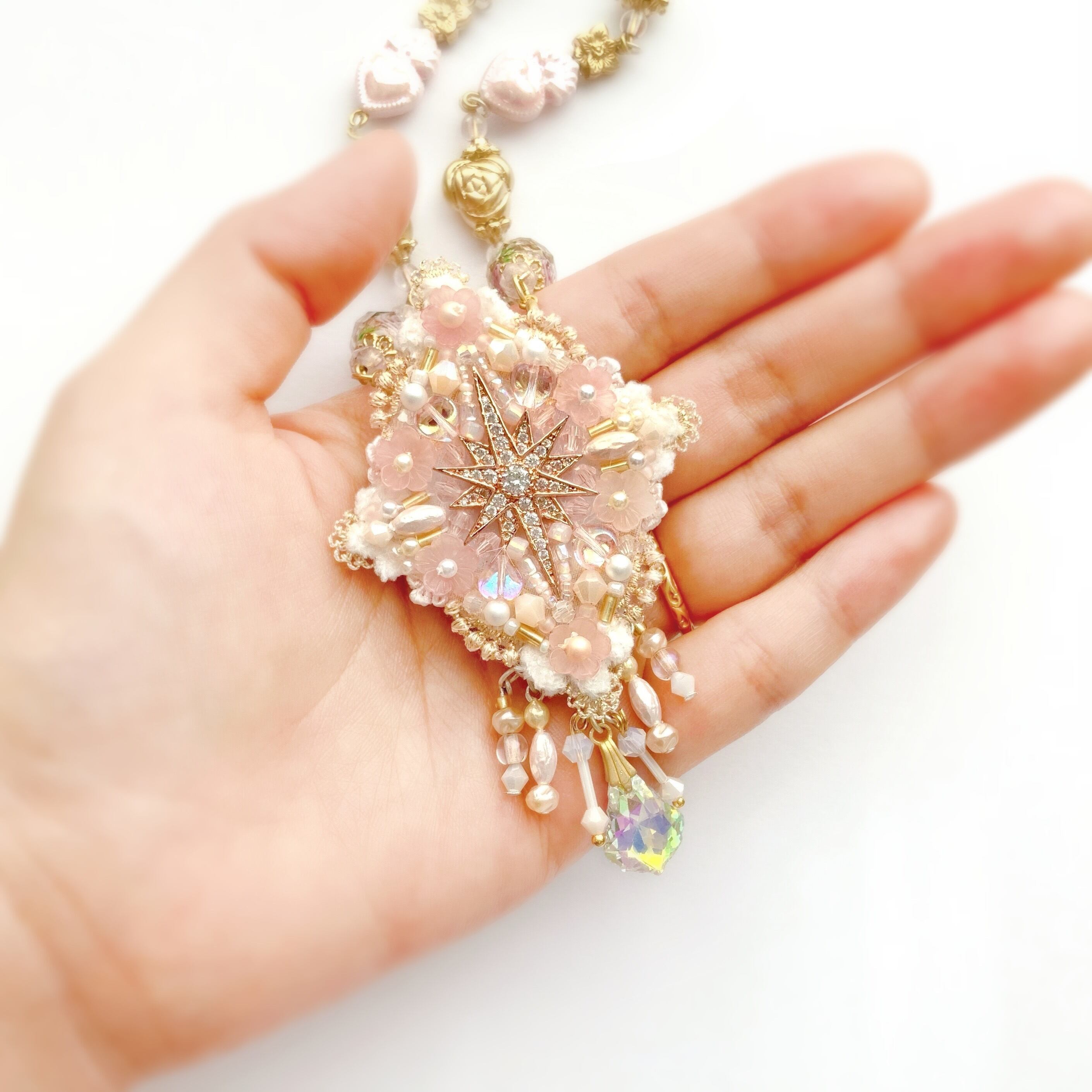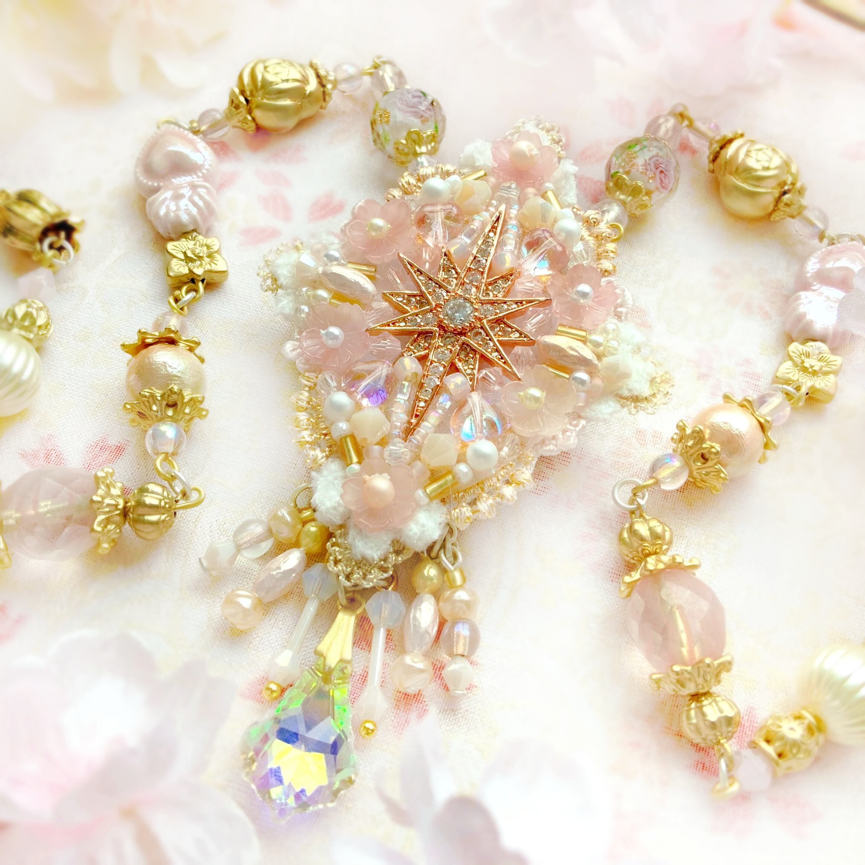 ビーズ刺繍のブローチ・ネックレス・バッグチャームの3wayです。