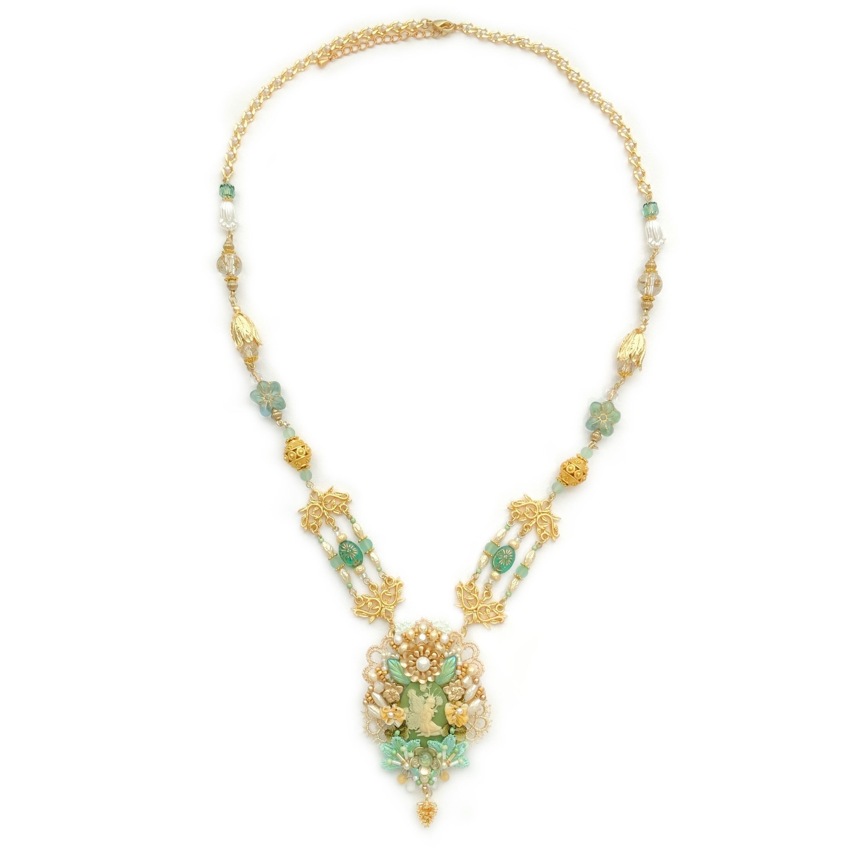 ネックレスは大体ブローチが胸のあたりにくる長さです。
