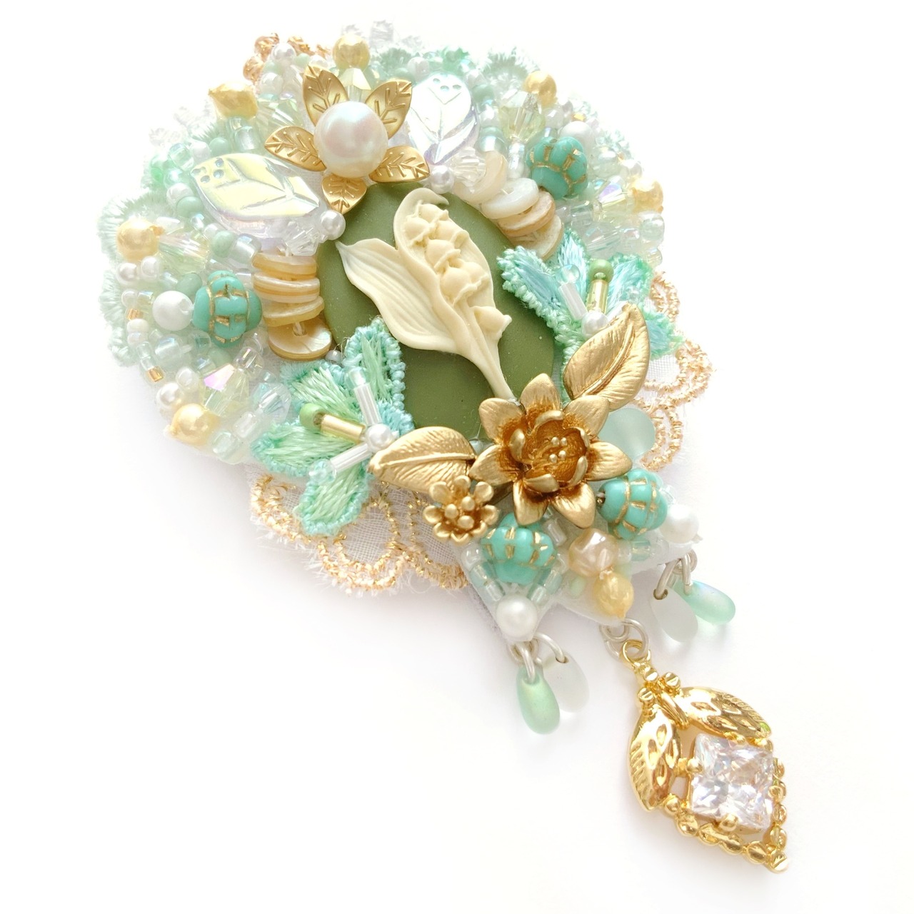 ビーズ刺繍のブローチ・ネックレス・バッグチャームの3wayです。