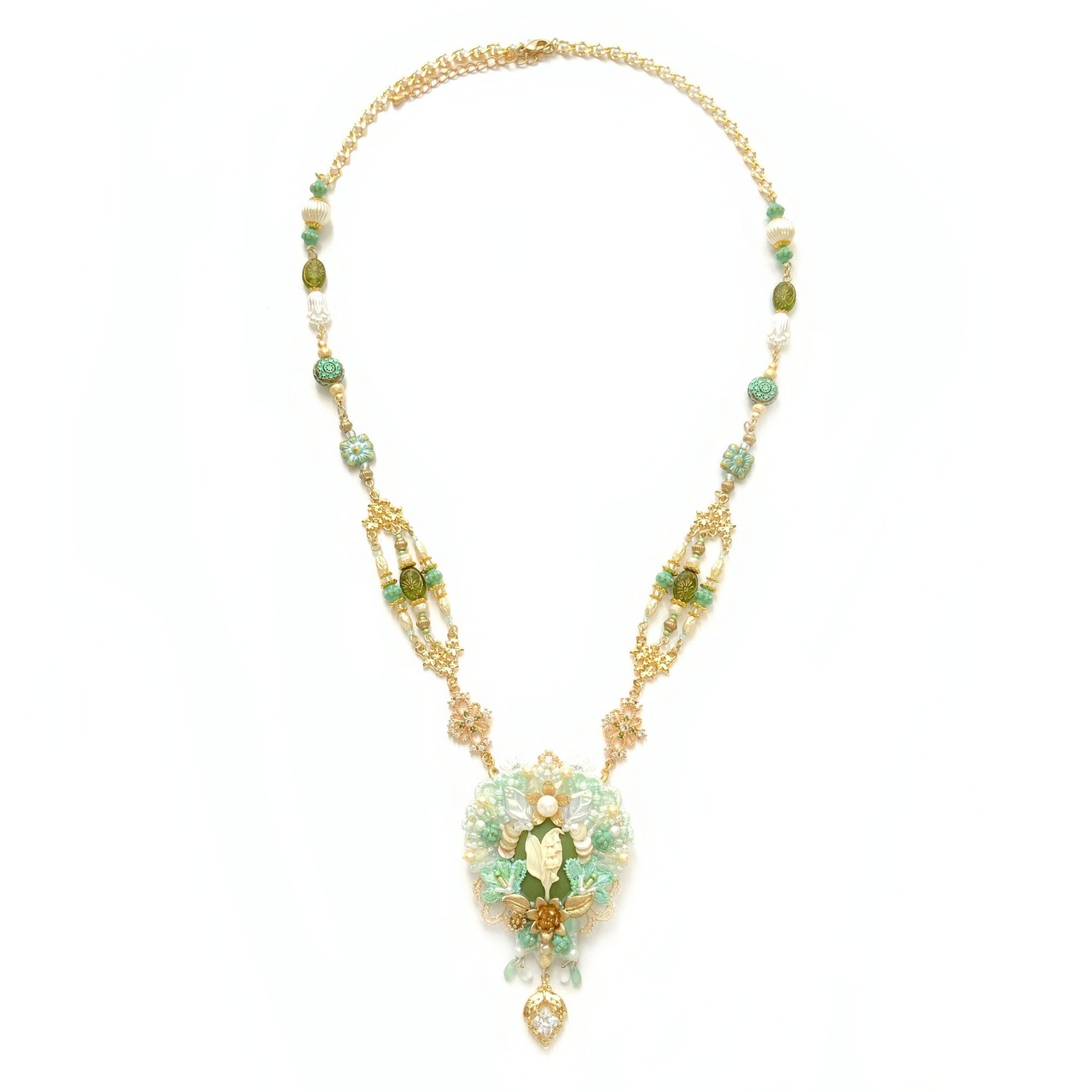 ネックレスは大体ブローチが胸のあたりにくる長さです。