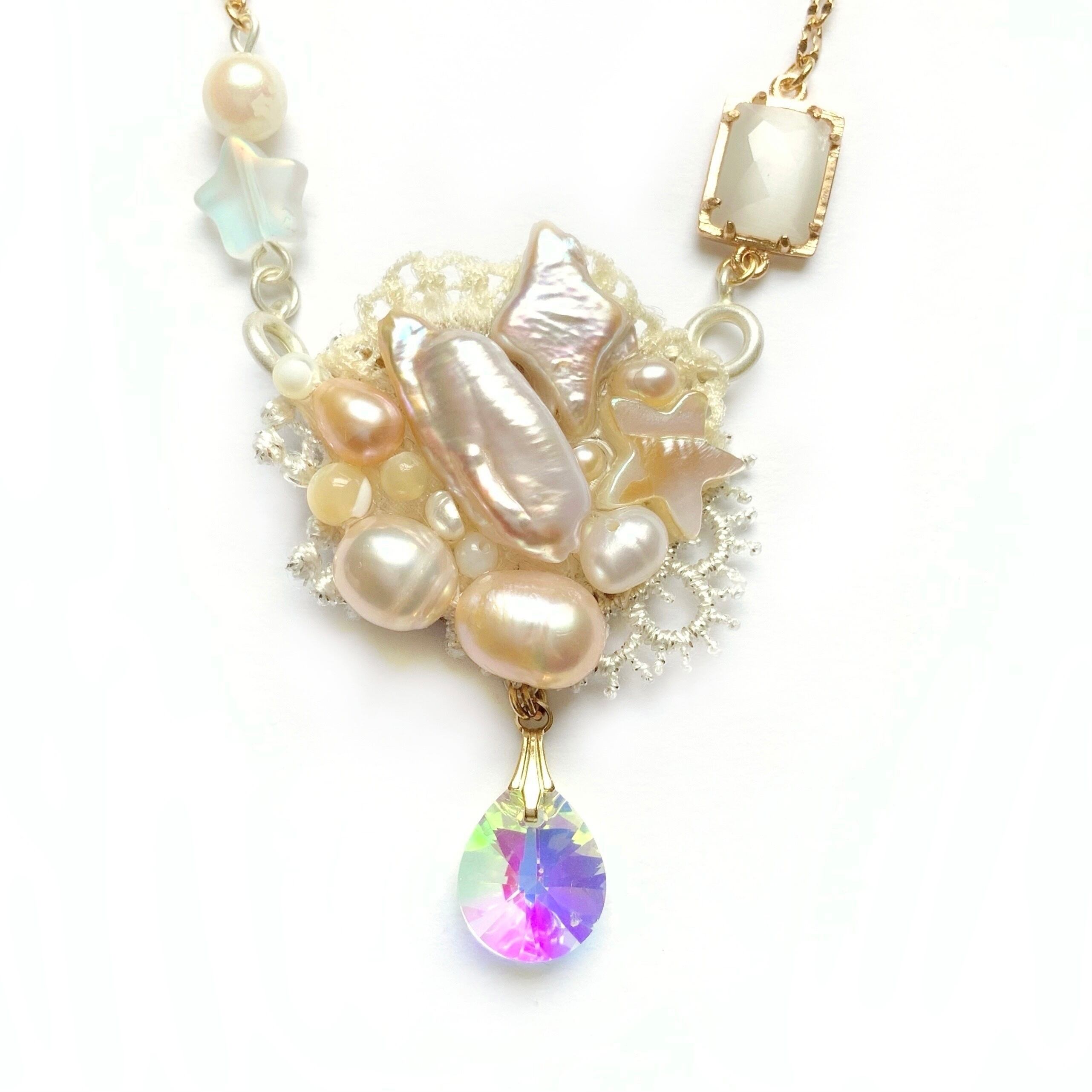 天然の淡水パールとビーズ刺繍のブローチ・ネックレス・バッグチャームの3wayです。