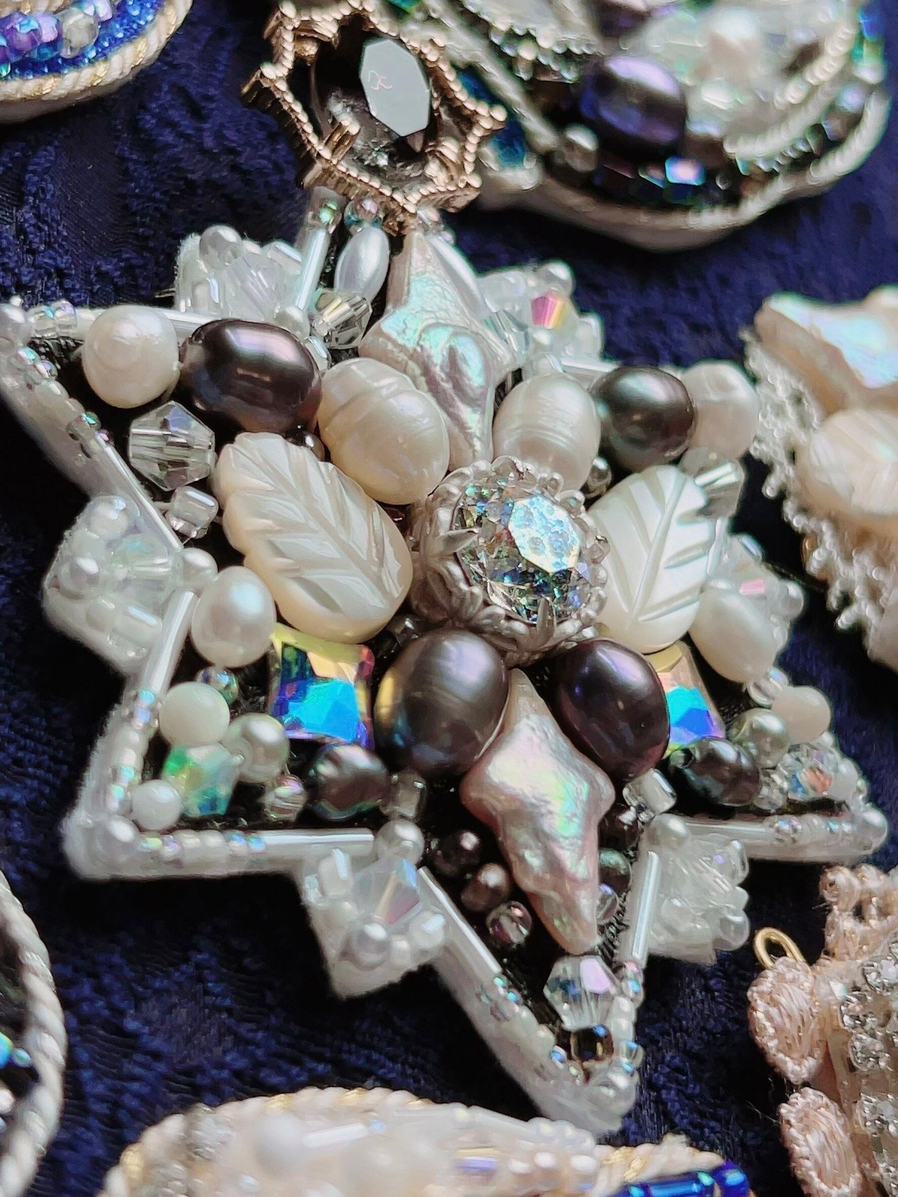 天然の淡水パールとビーズ刺繍のブローチ・ネックレス・バッグチャームの3wayです。