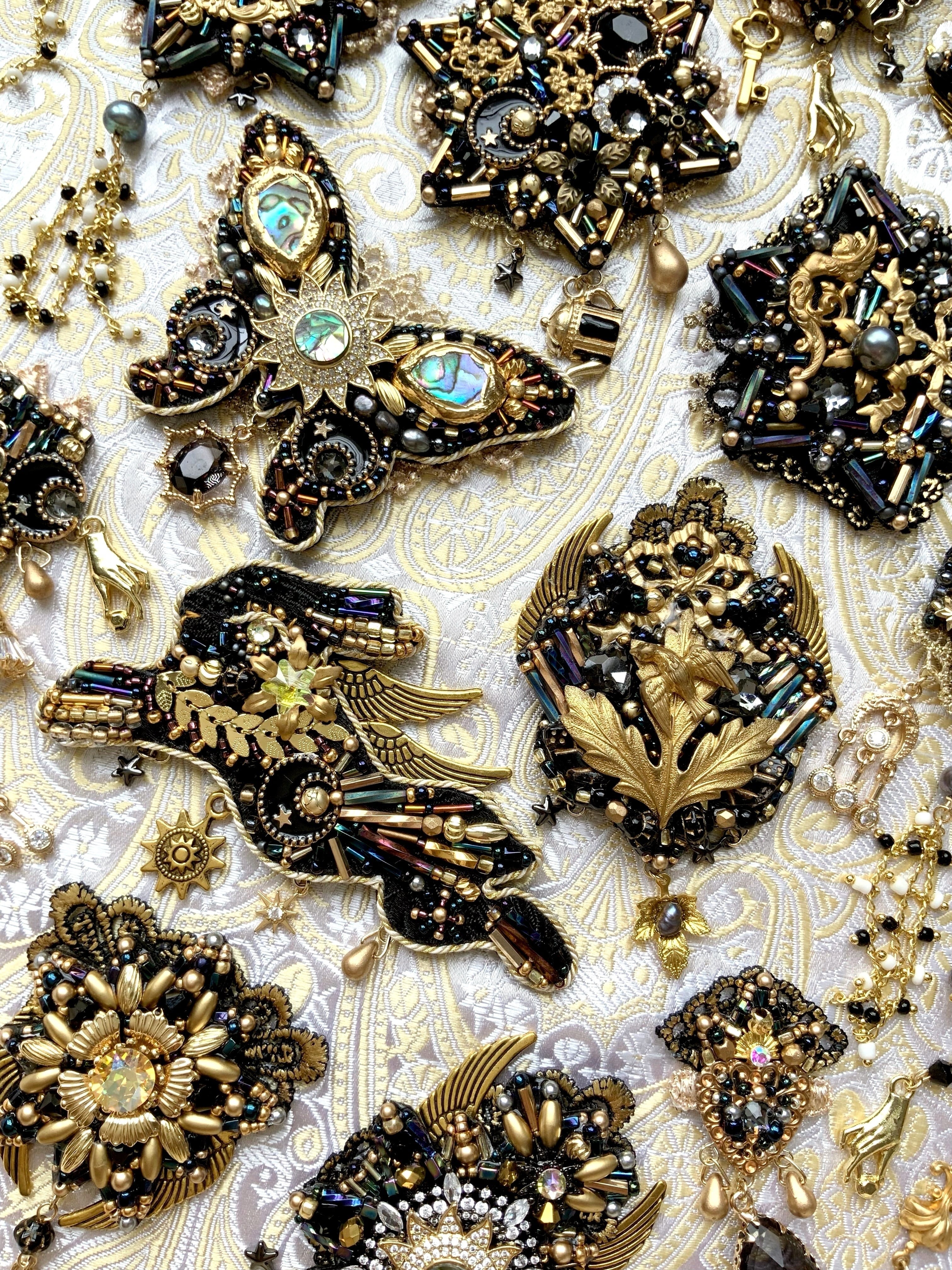 ビーズ刺繍のブローチ・ネックレス・バッグチャームの3wayです。