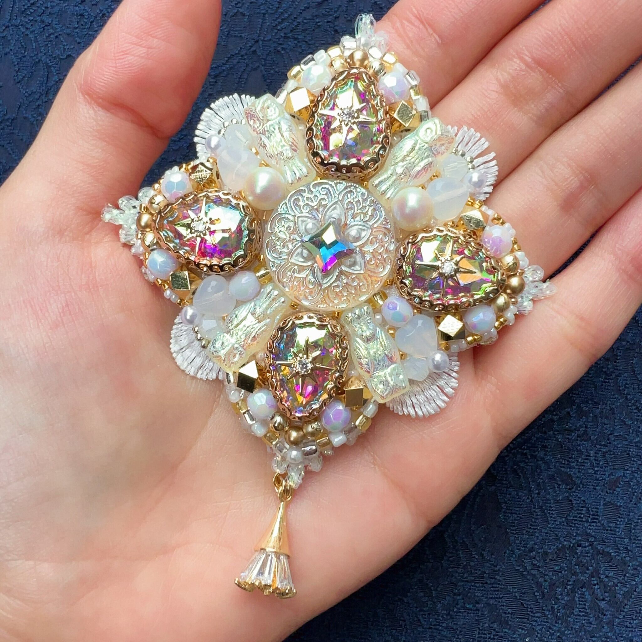ビーズ刺繍のブローチ・ネックレス・バッグチャームの3wayです。