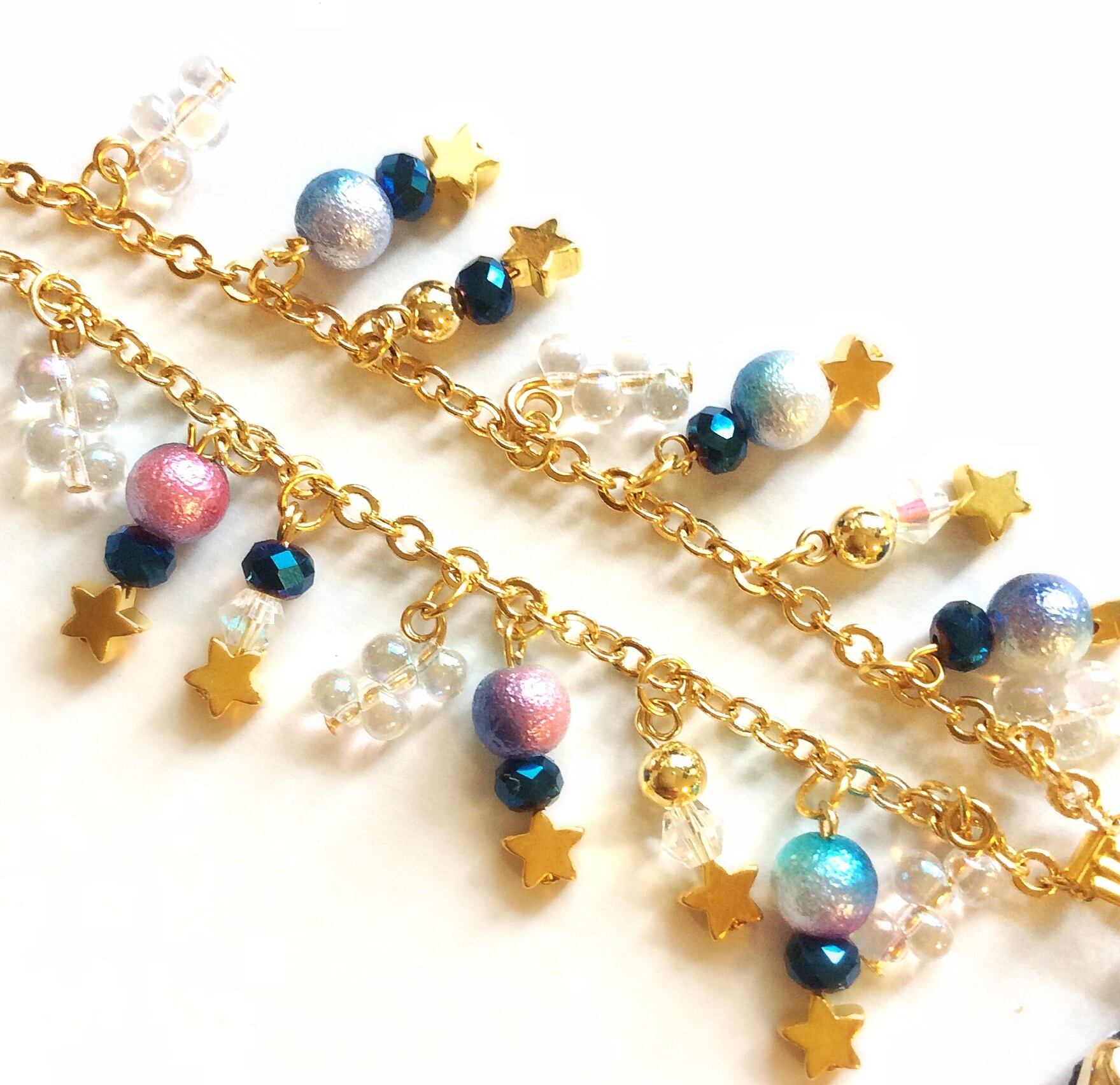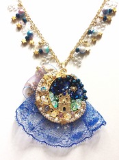 ビーズやスパンコール、青い鉱石のような輝きのストーン、スワロフスキーなどの