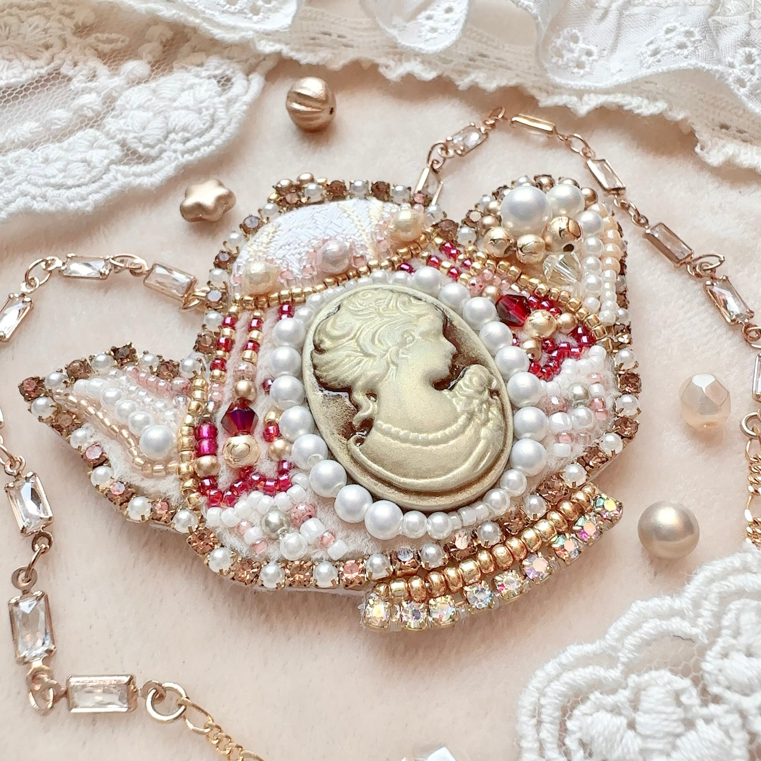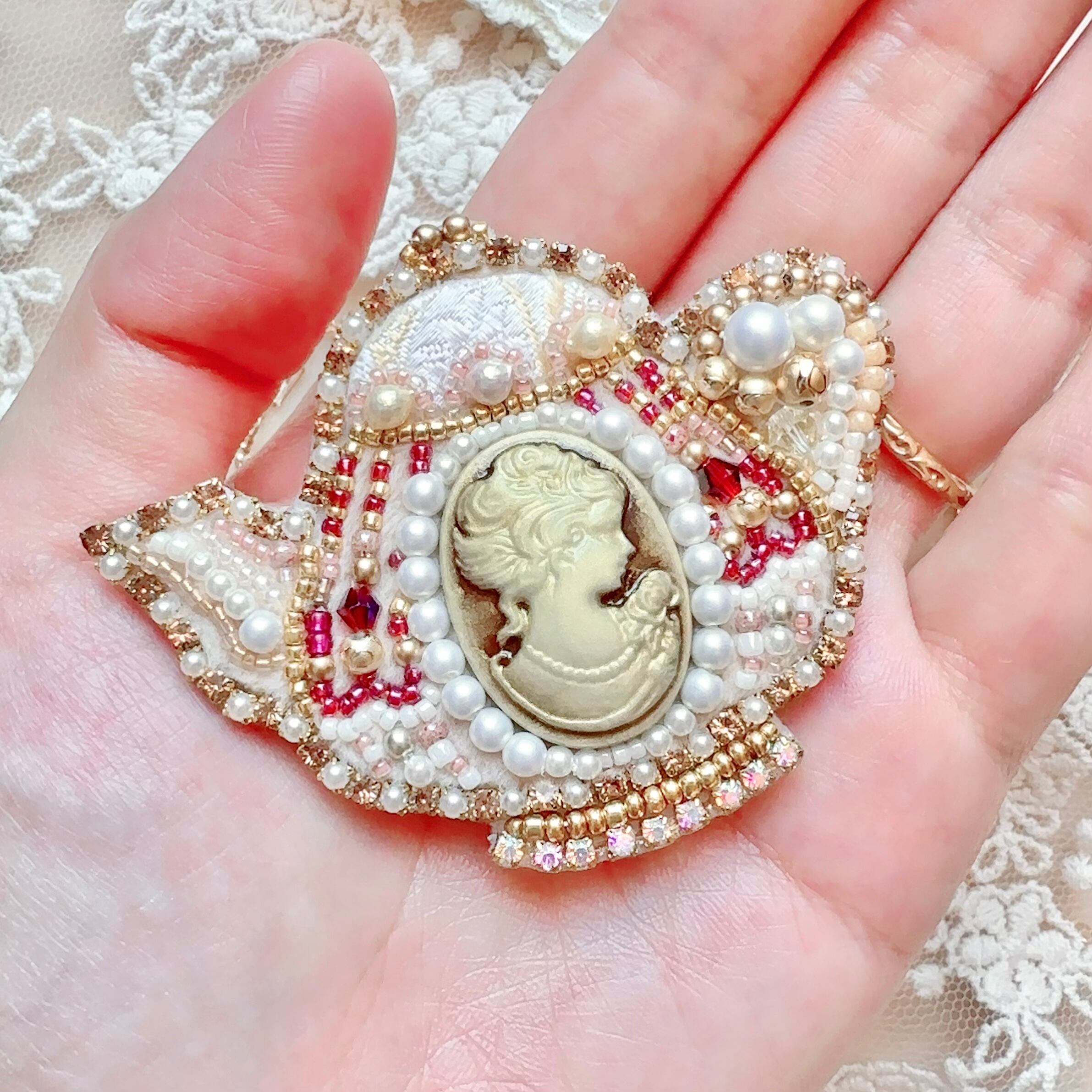 ビーズ刺繍のブローチ・ネックレス・バッグチャームの3wayです。