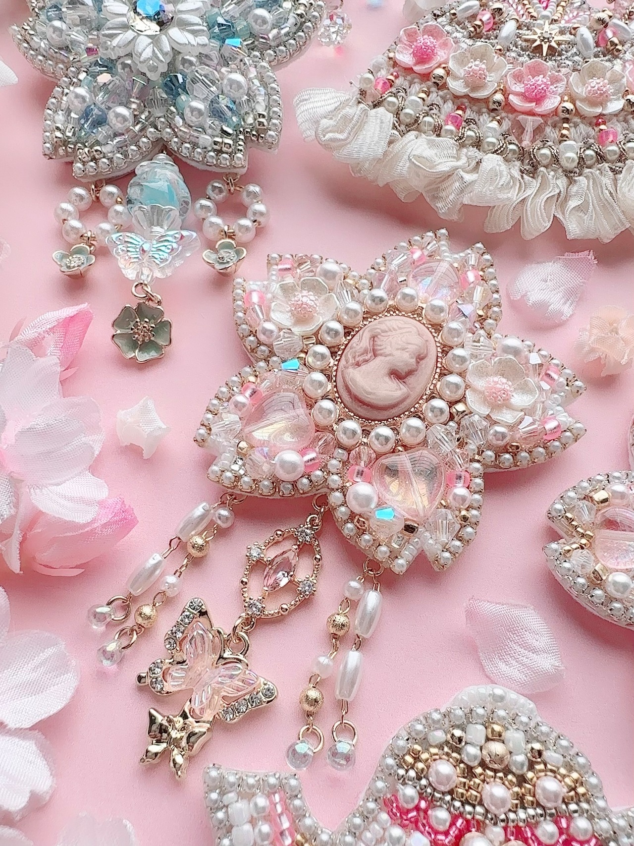 ビーズ刺繍のブローチ・ネックレス・バッグチャームの3wayです。