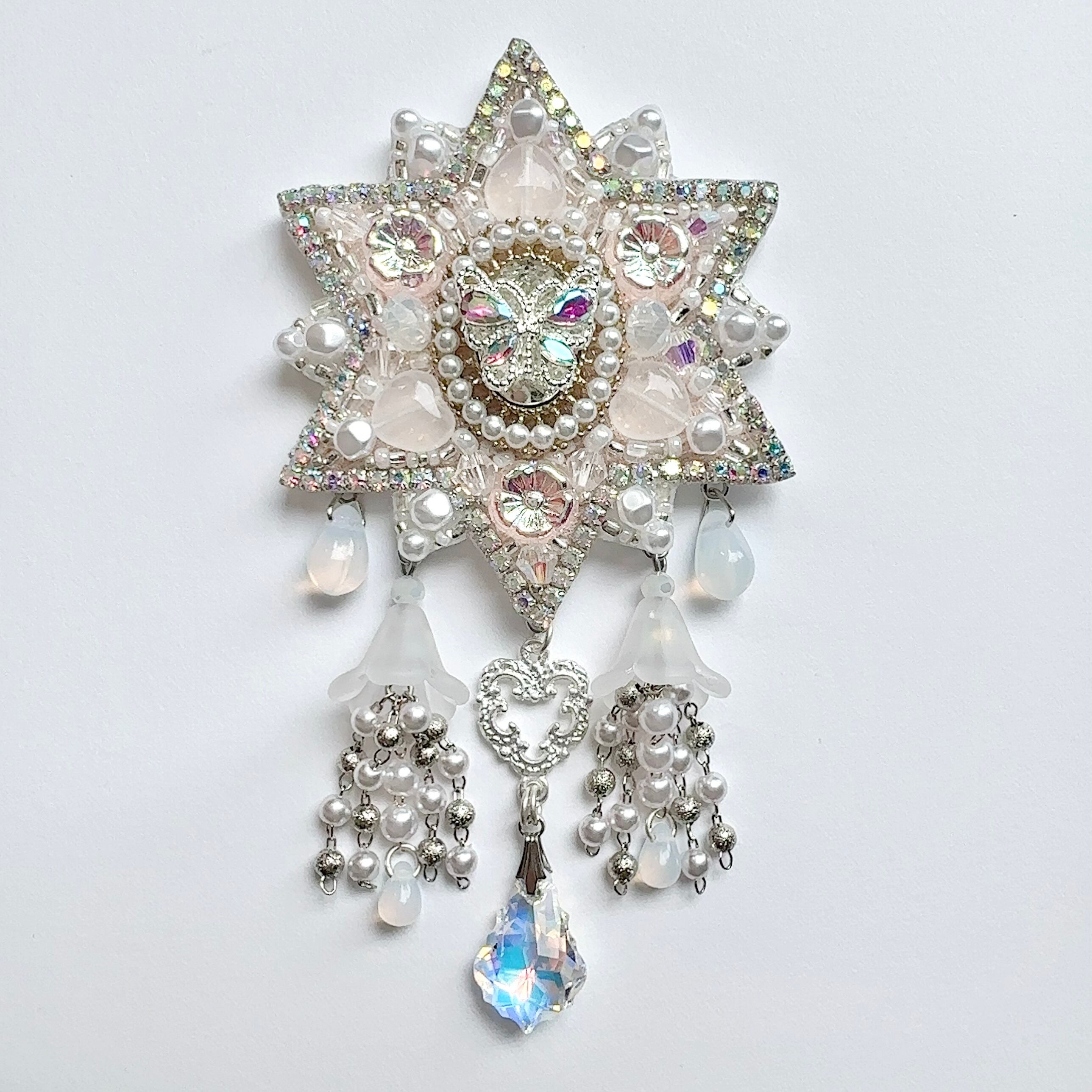 ビーズ刺繍のブローチ・ネックレス・バッグチャームの3wayです。