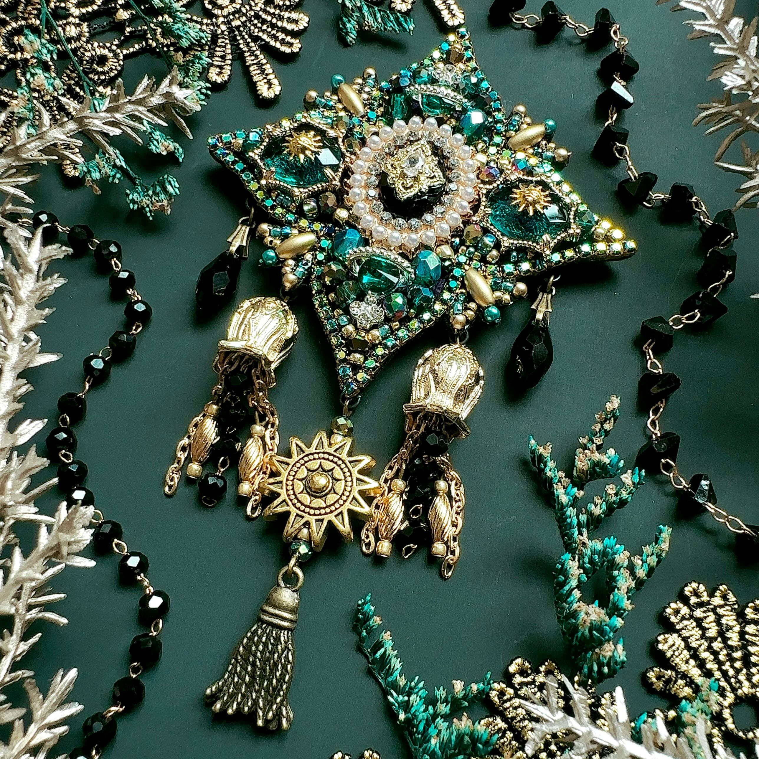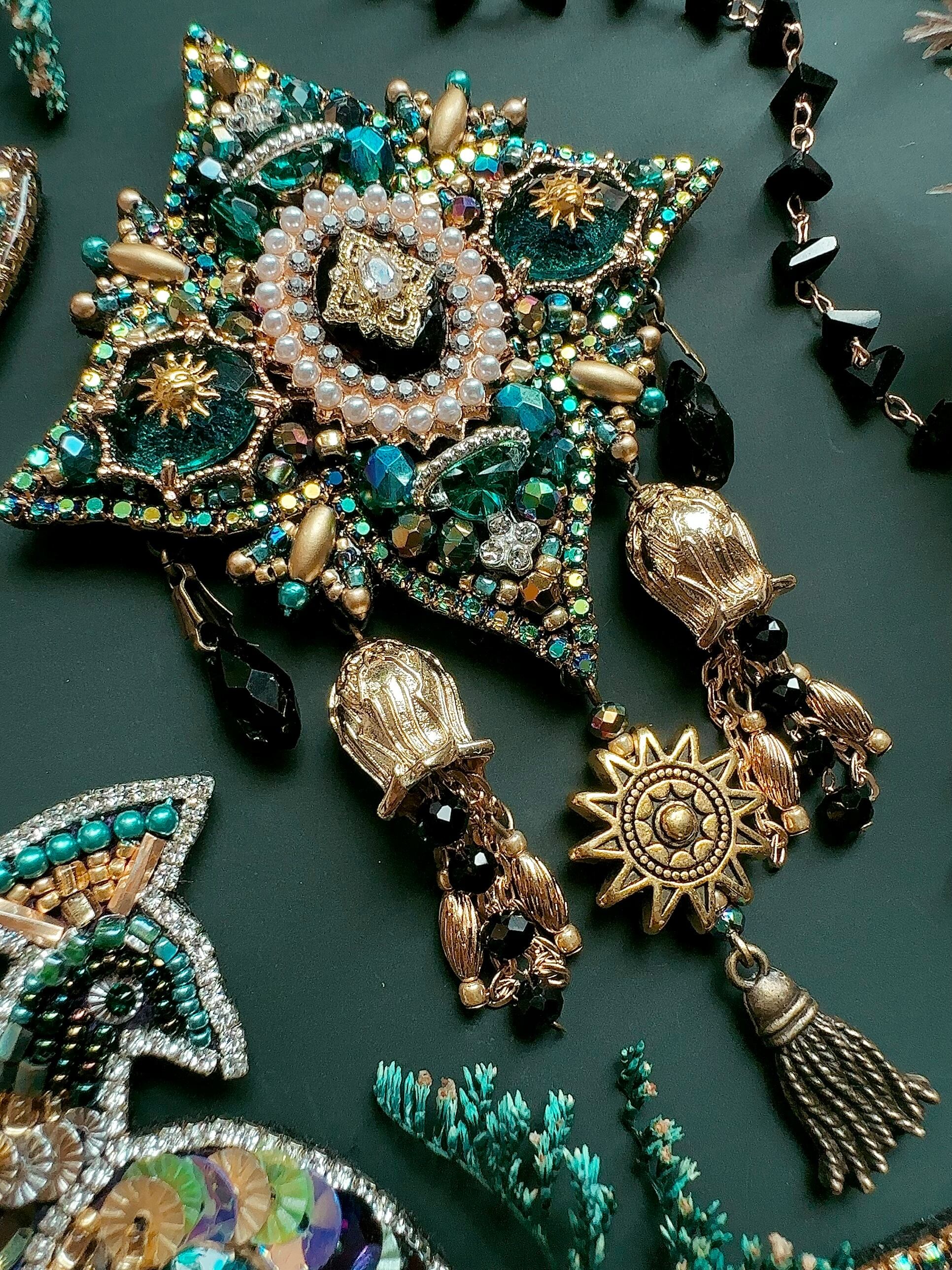 ビーズ刺繍のブローチ・ネックレス・バッグチャームの3wayです。