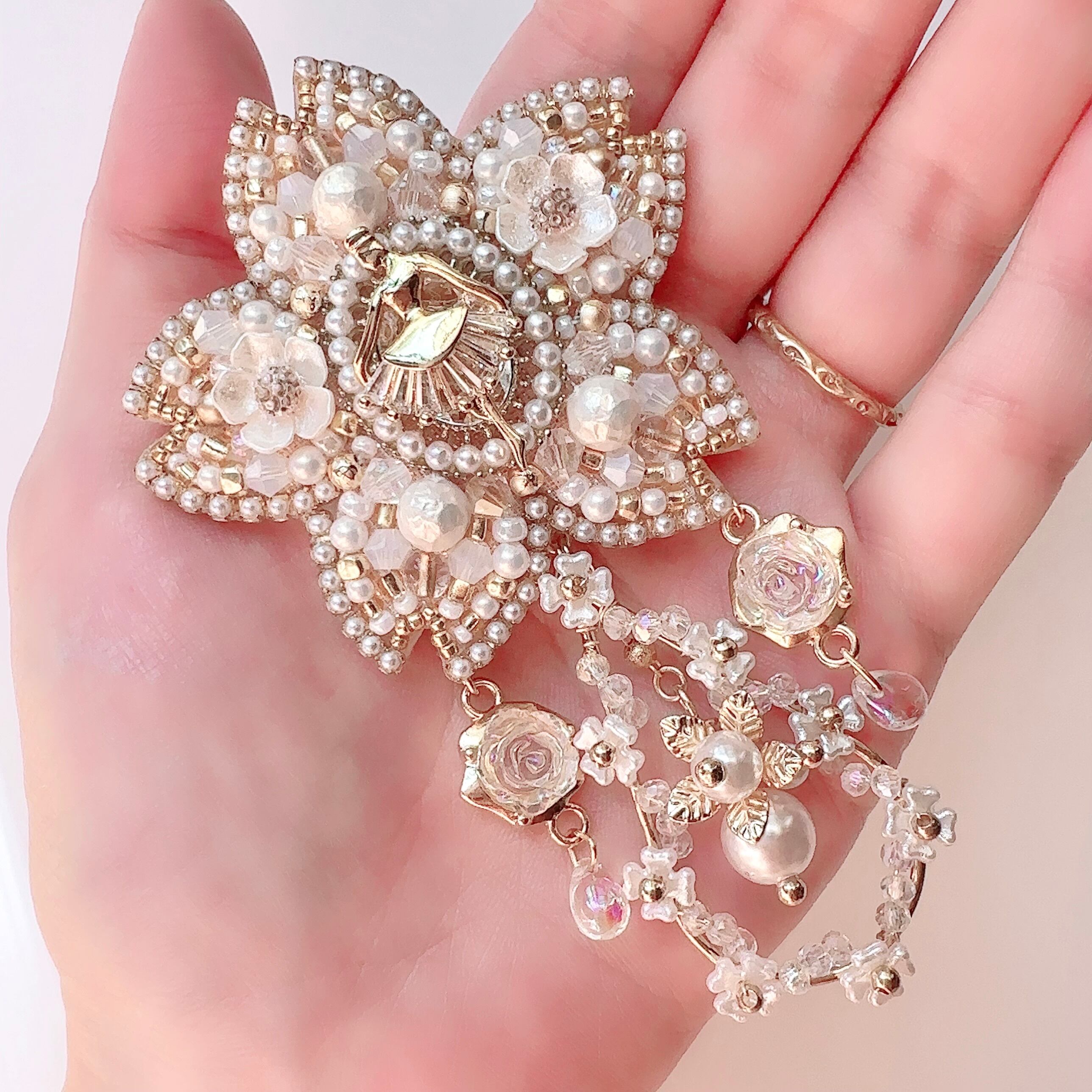 ビーズ刺繍のブローチ・ネックレス・バッグチャームの3wayです。